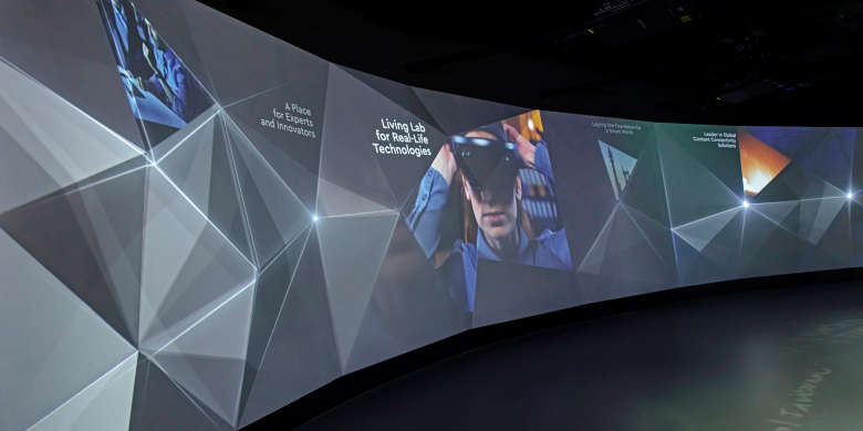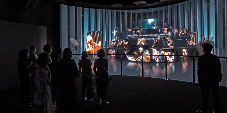 A cloud made of voices and faces lets us immerge into Luxembourg’s diversity. Connectivity all the way into space can be experienced in immersive images. A score by the Luxembourg Philharmonic Orchestra builds up to the highlight. A panoramic cinema celebrates Luxembourg’s pioneering spirit: 180° setup and 3D-imaging technic create a three-dimensional effect without any additional aids. A slide through a beautiful valley with trees, birdsong, and a specifically conceived scent creates a most entertaining finale.