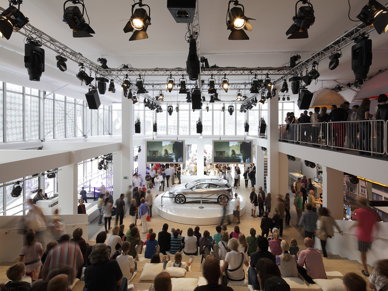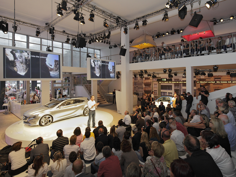 To celebrate the 125th anniversary of the invention of the automobile, Mercedes-Benz hosted numerous events in the heart of Stuttgart as part of Automobile Summer 2011. The centrepiece of the Stuttgarter Sternstunden celebrations was the 1,500 m² mb! Lounge, which presented a dazzling array of new concepts and futuristic design ideas and provided an insight into the upcoming Mercedes-Benz brand worlds. By day, the lounge acted as an exhibition space and discussion forum, but at night it became a venue for talks about burgeoning trends, as well as presentations and parties.
