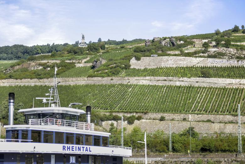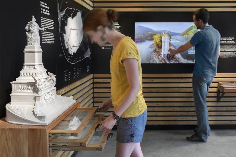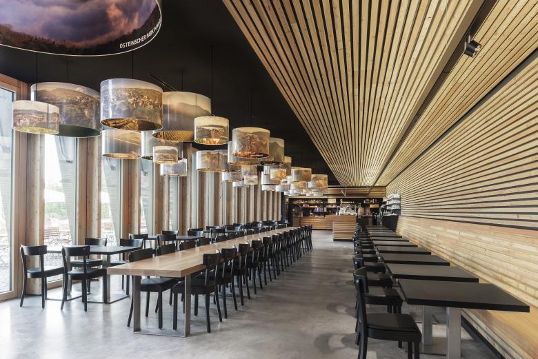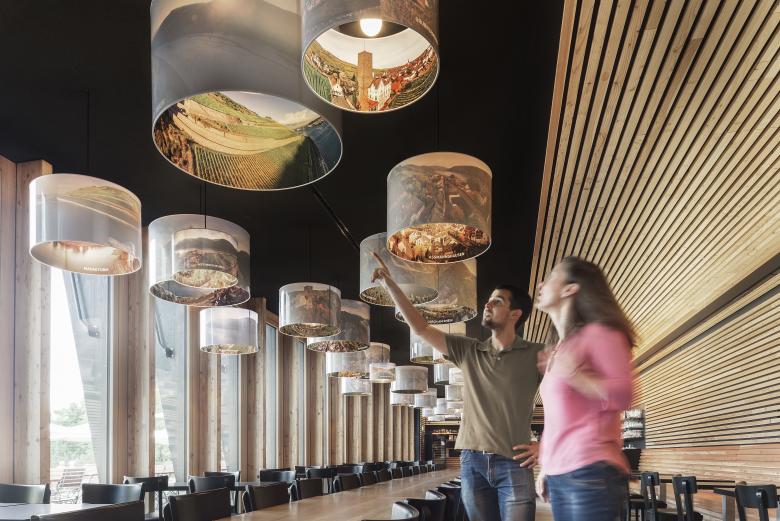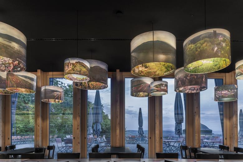 Upon entering the visitor centre, guests can learn all about the area and its geography: from an overview of the Rhine’s course through the Rhine Gorge to the Niederwald, to a model replica of the Niederwalddenkmal monument. Using photo panoramas projected onto »seamless screens«, visitors can embark on a virtual journey through the Rhine Gorge. In the restaurant area, guests are invited to take a seat and enjoy a well-deserved rest at the banquet table. Lampshades display 360° panoramas of the Rhine’s journey from Bingen to Koblenz. In keeping with the centre’s theme, these lampshades perfectly tie together the communication and restaurant areas.