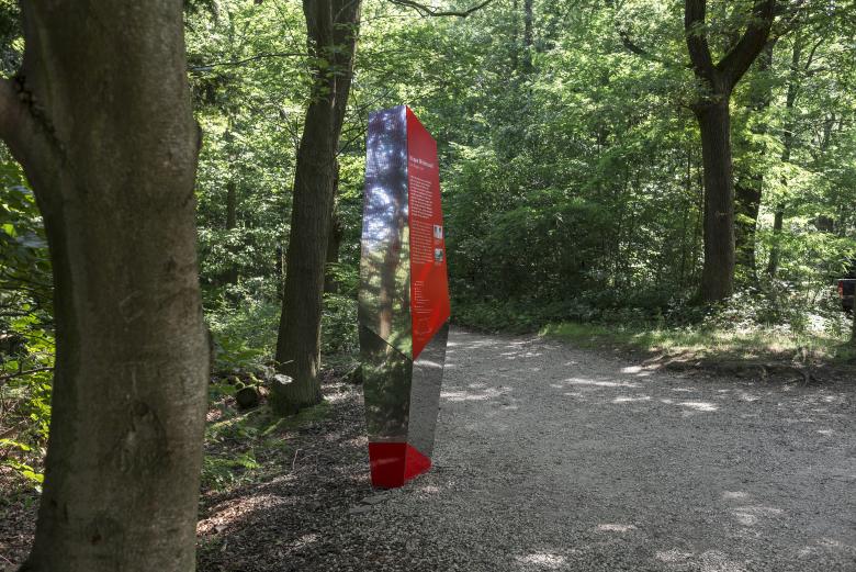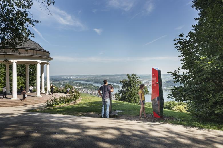 Under the motto»Rhine. Reise. Rast.« (Rhine. Travel. Rest.), visitors are taken on a journey through the region to discover its fascinating history. In the park, a system of information pillars guides visitors and offers interesting facts about the area. The surfaces of the pillars are reflective on all sides, making them almost unnoticeable except for the information layer, which stands out thanks to its red base plate.