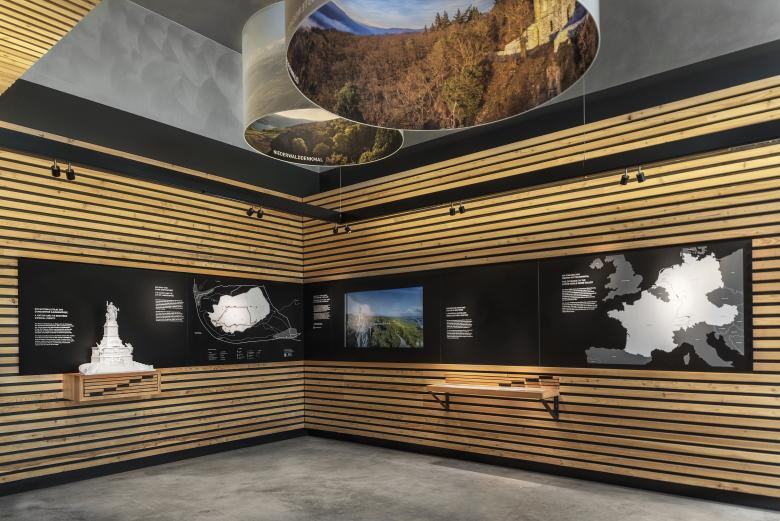 The Niederwald near Rüdesheim is the window into the world heritage cultural landscape of the Rhine Gorge, which stretches across 67 kilometres from Bingen to Koblenz. To celebrate the region’s 250-year birthday, the original landscape garden has been restored and a new visitor centre has been added to this internationally renowned tourist destination. jangled nerves is responsible for the interior design of the information centre with restaurant area. A new navigation and orientation system has also been installed in the surrounding forest.