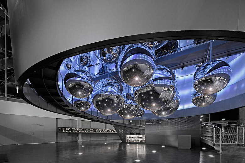 Inspired by the molecular buildup of the material steel the idea arose to open the crucible of the new visitor- and exhibition center of the voestalpine AG and to treat the resulting space as a unity. Congruously to the crystal structure of metal, the space was equipped with a graticule of metal orbs that are to symbolize the smallest, atomic module of the material. To function as integral information- or experience facilitator some orbs were made accessible or equipped with exhibits, others were used as projection surfaces. This resulting walkable installation enables the visitor to unconsciously feel as if he could literally dive into the exhibition’s core – the material steal.