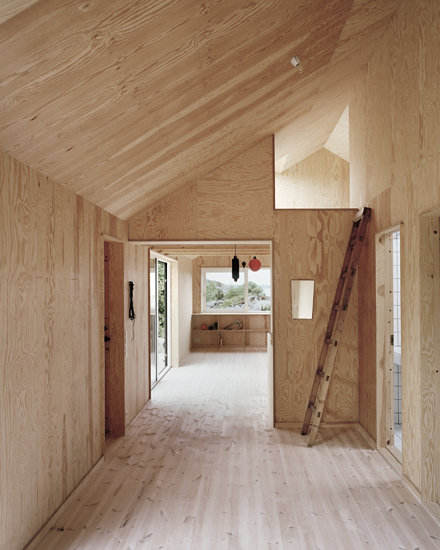 The new facade is cladded in plywood, coated in black pine tar just like the traditional way of preserving wooden boats. The roof is coated in simple tar paper and has thin plywood eaves with integrated aluminum gutters, coated in black. The interior is all in natural pine and where plywood is used for both cladding and construction.