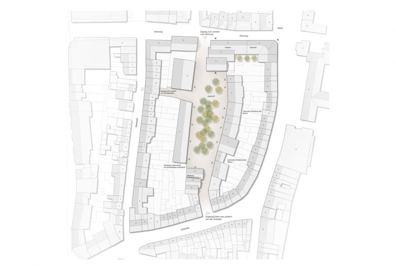 The first-place design responds to the play of inner-city spaces in the historic Old Town Brühl. The top end of the city hall expansion at the northern end and a potential residential development toward the south create an exciting interplay. They create view relationships from the adjacent urban areas and provide the Janshof a dimension, which will not rival with the immediately bordering market. Access to the new square with its highly inviting residential character destined to become representative address is provided by three alleys. Structural densifications strengthen the urban space.