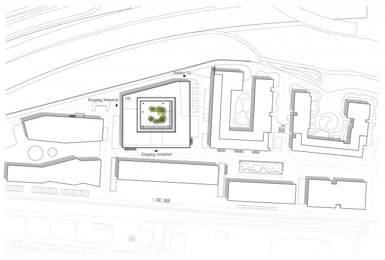The arcades on Maneggplatz invite people to enter the landscaped inner courtyard. The new residential building is accessed from there via six staircases, which divide the building volume into manageable units. The age-appropriate apartments have a loggia and receive daylight from two sides. The attic will be indented on the courtyard side, creating roof terraces all around and allowing more light into the inner courtyard.