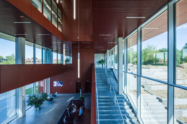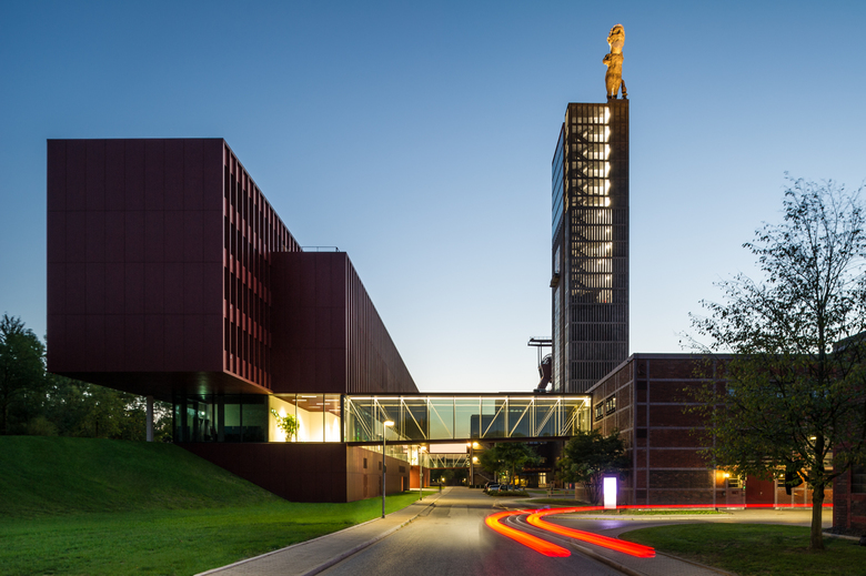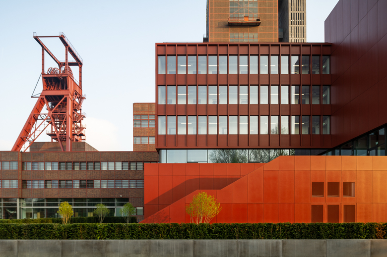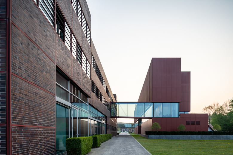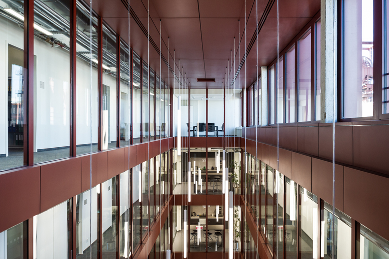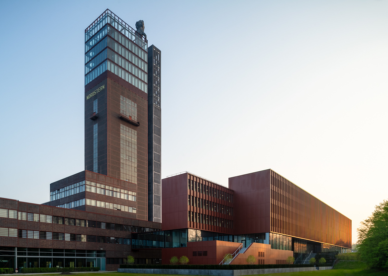 An additional administrative building for approximately 300 employees of the Vivawest has been planned for the area of the former Zeche Nordstern mining site. The former mining site has been the real estate group’s headquarters since 2012. The objective of the architectural competition was to come up with an image-creating, functional and sustainable building offering approximately 6,500 sqm of usable space replacing the former boiler house façade, which would integrate into the Campus Nordstern where some of the development is heritage-protected. JSWD ’s emphasis was to view the new construction not as a solitary building but rather as an integral component of the campus. The existing principal building with its prominent high-point, which is visible from afar, remains the top address there. The incorporation of essential design features of the surrounding industrial architecture in terms of scale, proportion and materiality molds the buildings into a recognizable unit thereby creating a powerful appearance for the surrounding campus. A transparent, inter-building communication level has been added between the basement and the four office levels of the approximately 120 m long new office building. Skywalks connect the main building and workshop at almost the same level to this “[Coal] Seam Level”. The levels above will see the creation of areas of new work environment.
