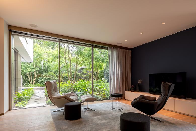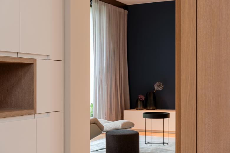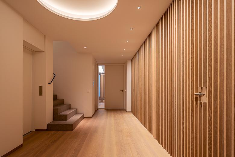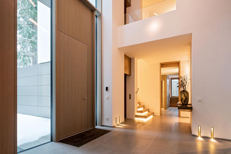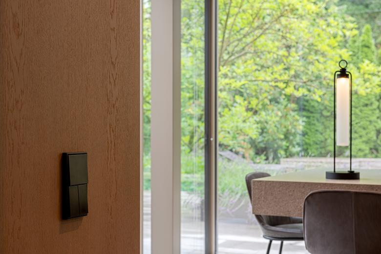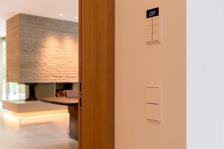 The interior design is high-quality. With a reduced material selection and a sensitive lighting concept, a minimalist and at the same time sensuous atmosphere has been created. Both in interiors and in the design of the facade, white wall surfaces meet natural stone and wood. Built-in cupboards create plentiful storage space inside and provide a reduced, tidy atmosphere. Door grips milled into doors and cupboards are an expression of this absolute minimalism. The simple design of the switches, push-buttons and sockets of the LS range from JUNG integrate perfectly into this ambience. The LS 990 flat switches and the KNX F 40 push-buttons in the colours antique brass and white fit perfectly to the puristic but high-quality design. With the F 40 room controllers, temperature, light and shading can be conveniently controlled.