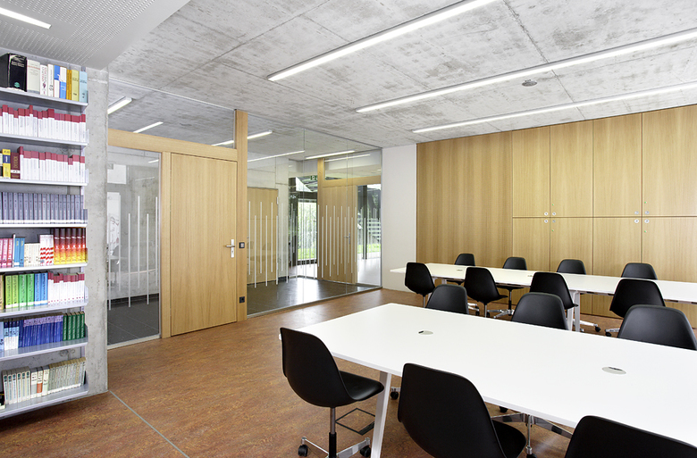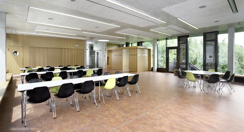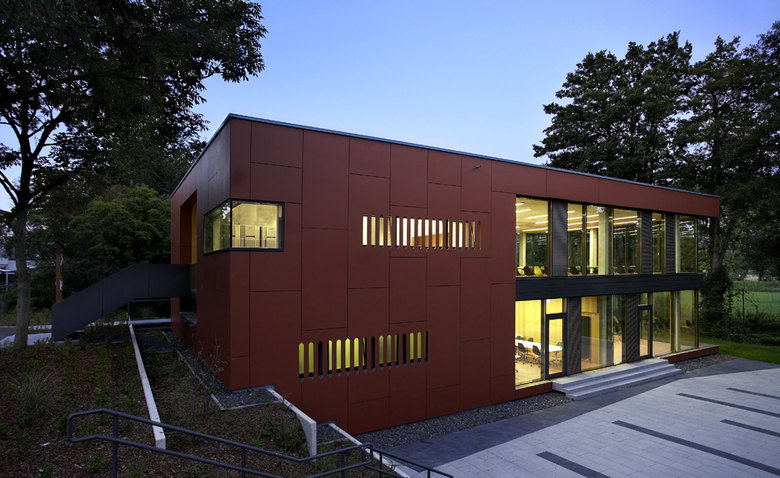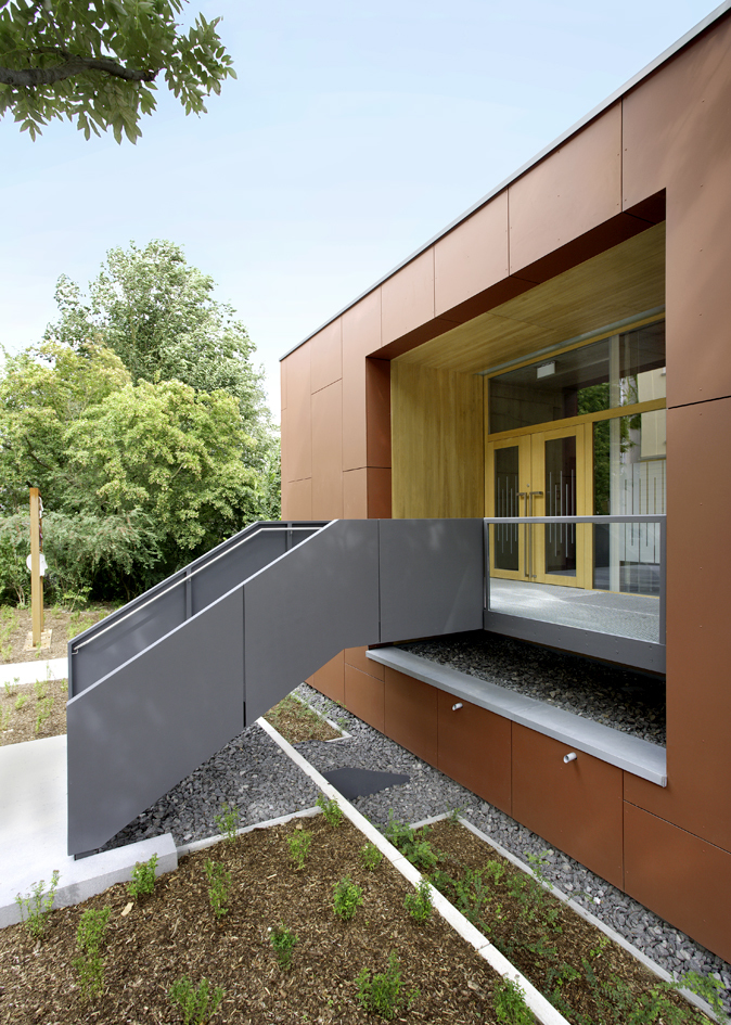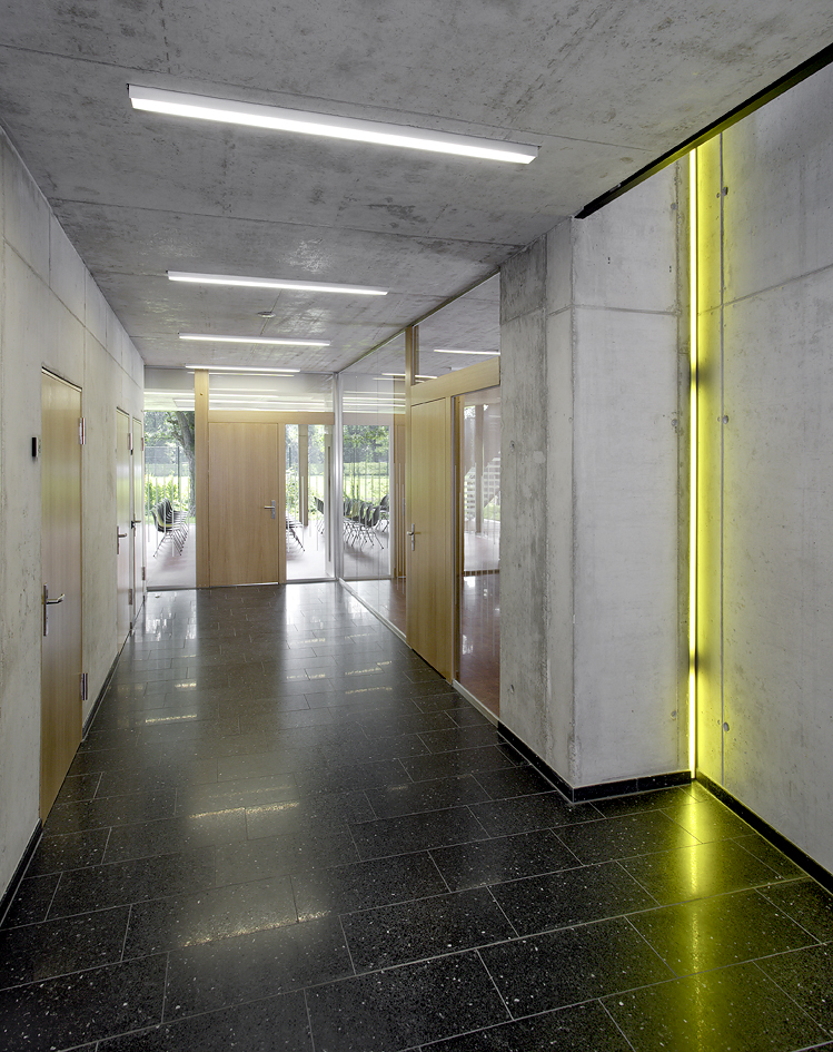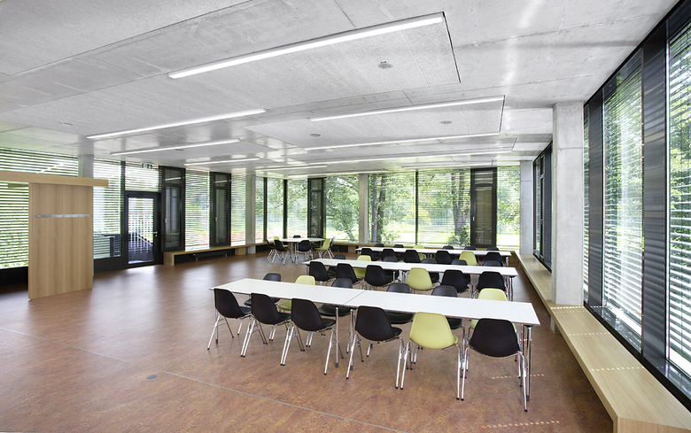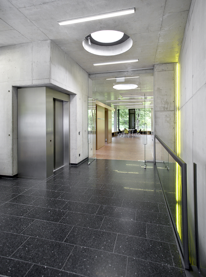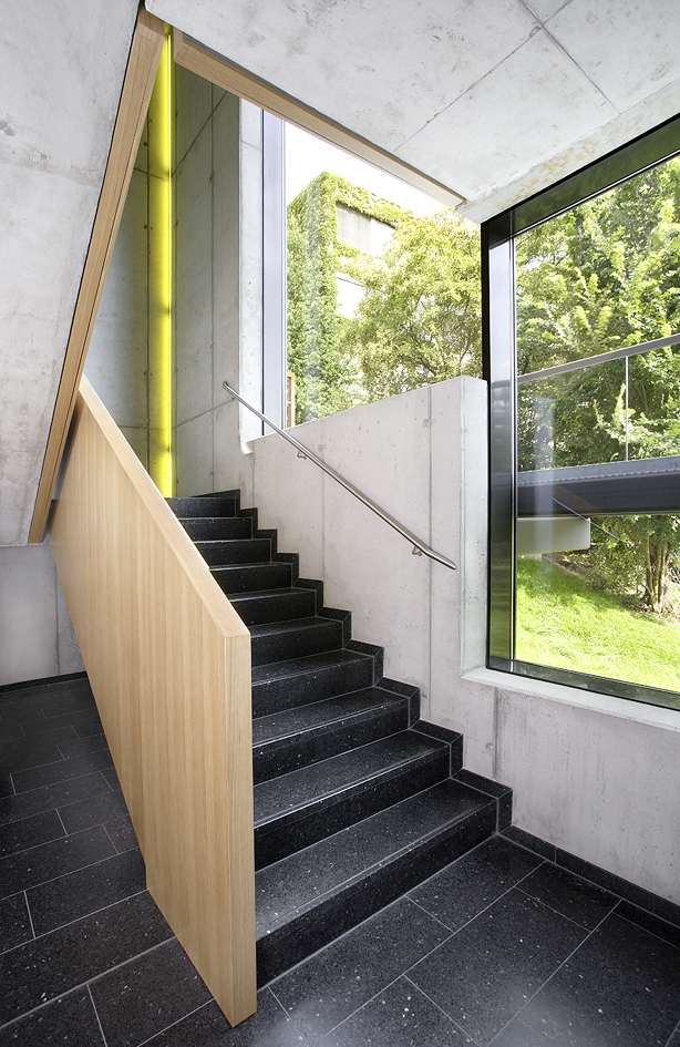 Der zweigeschossige klar strukturierte Baukörper ist spannungsvoll an der Hangkante zum angrenzenden Grünraum gesetzt. Die Transparenz des Baukörpers ermöglicht vielfältige Einblicke, Ausblicke und Durchblicke und unterstreicht damit die Nutzung als „offenes Haus“.