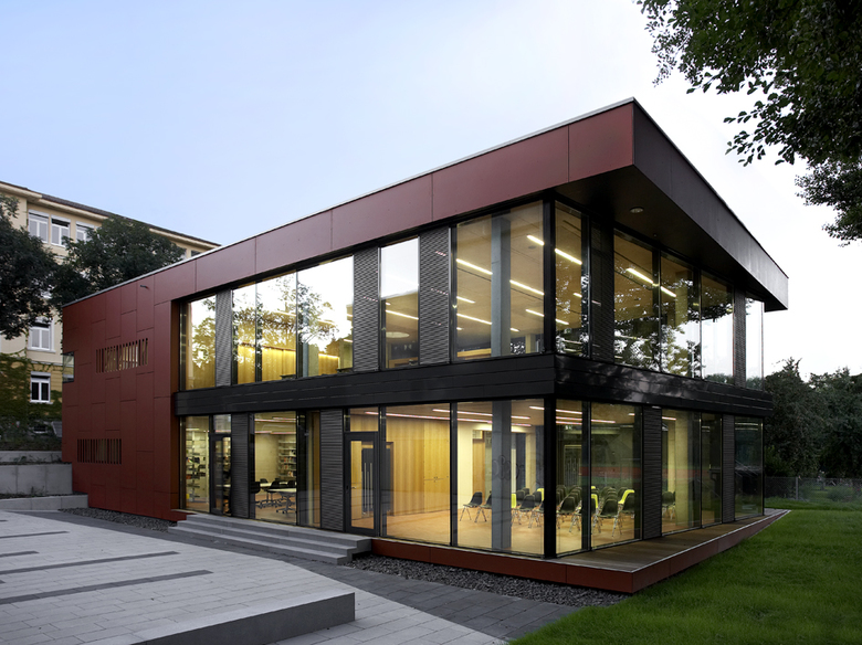 Das Multifunktionsgebäude für Bildung und Betreuung (IZBB) ist als Pavillon konzipiert und fügt sich angemessen und selbstbewusst in das Ensemble der Altbauten ein.