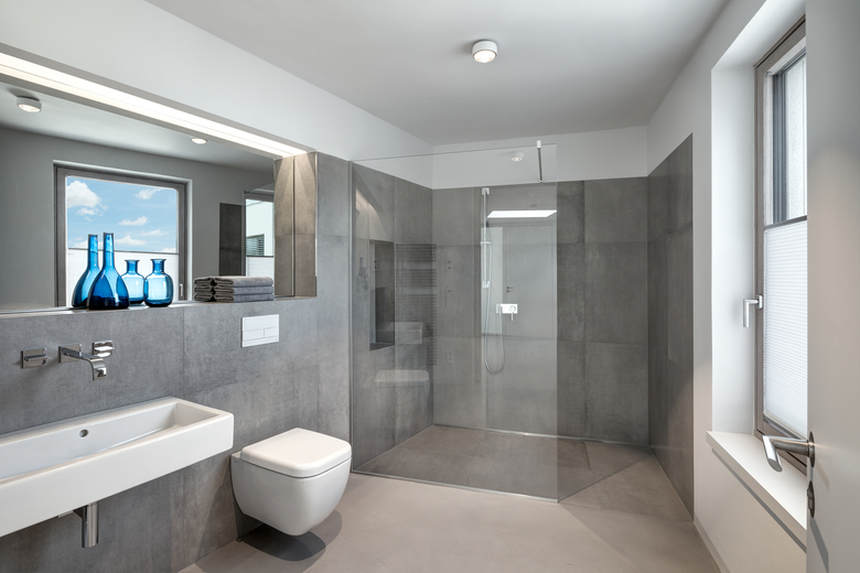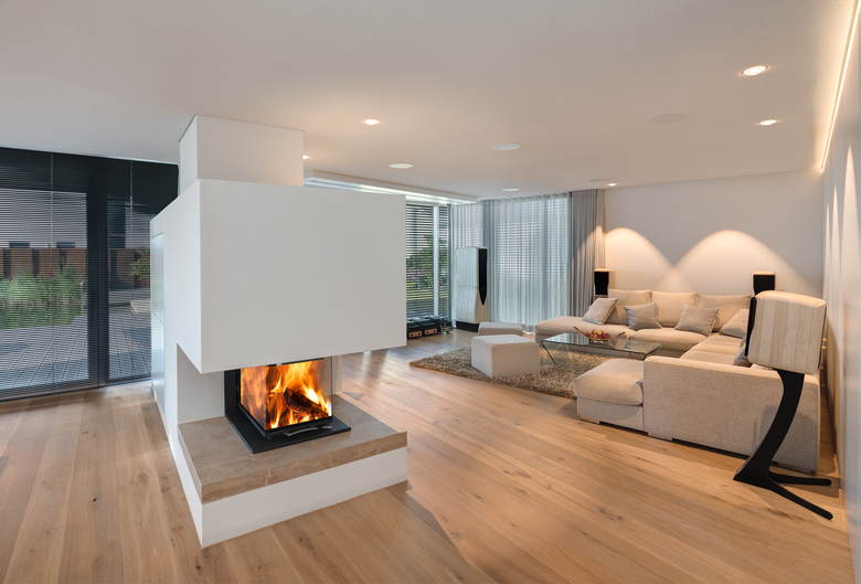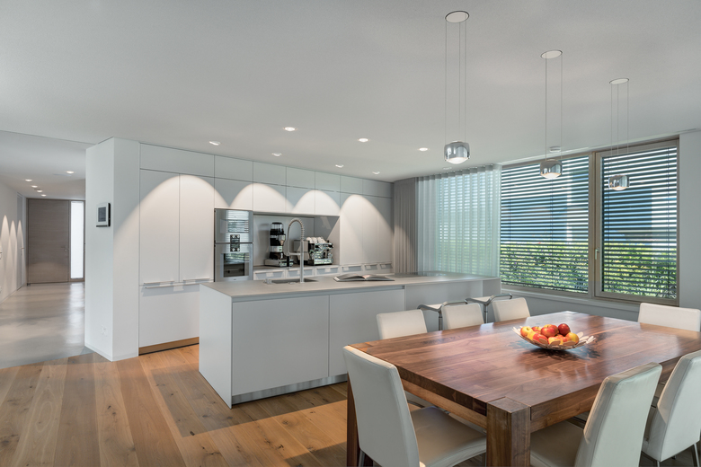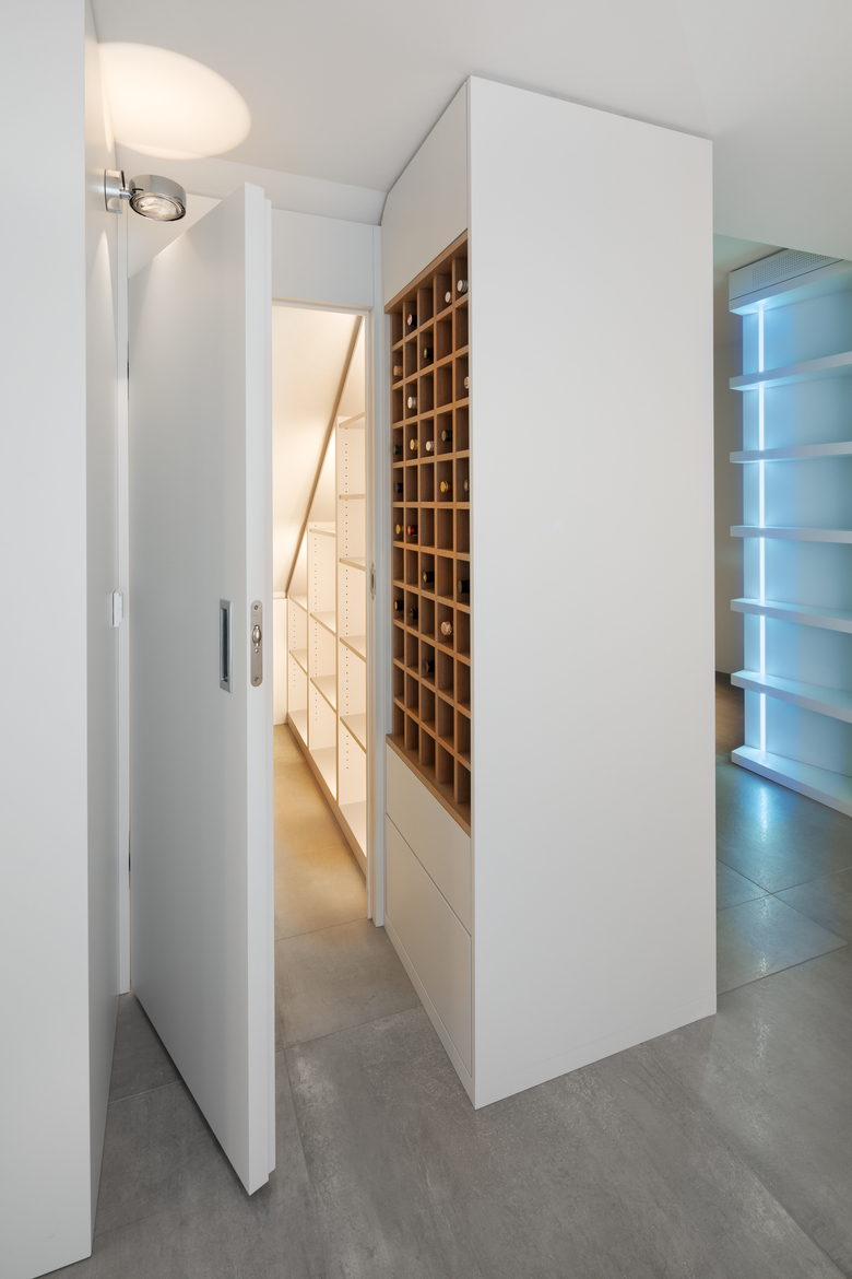Flurbereich und die Bäder besitzen einen Boden aus geschliffenem Estrich. Die Wohn- und Schlafräume erhalten ein Eichenparkett. Großzügige Einbaumöbel sorgen für einen einheitlichen Charakter der Inneneinrichtung.