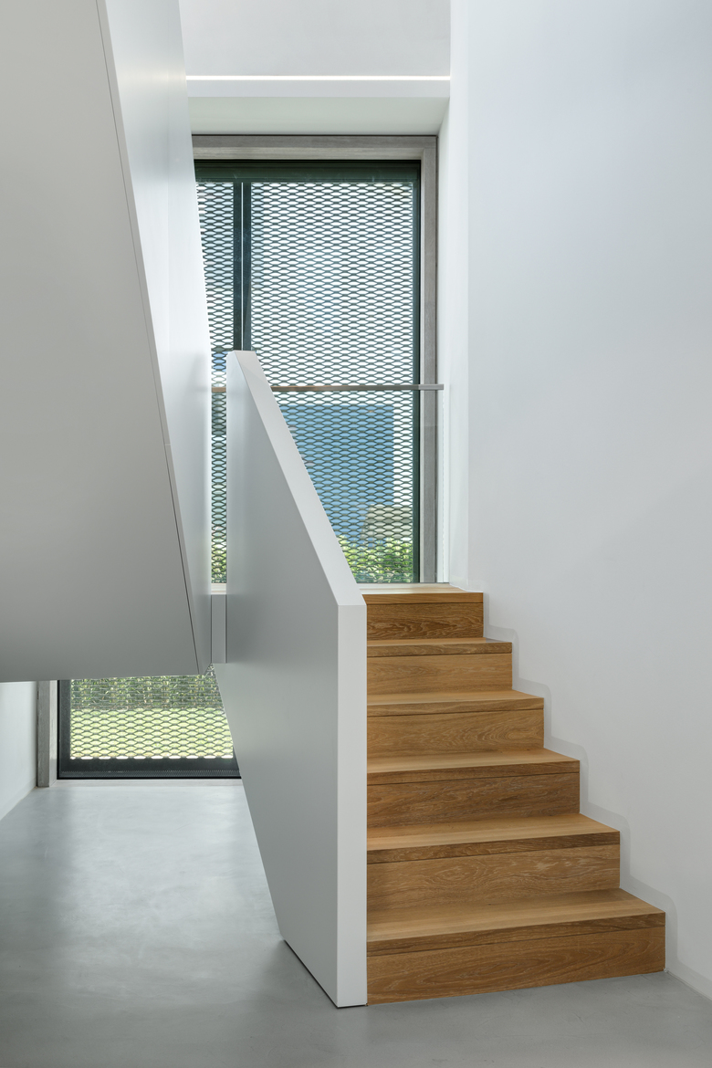 Generell wird das Wohnhaus durch zwei kombinierte Volumen gebildet. Der Eingang befindet sich in der Schnittstelle der beiden Gebäudeteile und tritt als portalartiger Einschnitt ins Gebäude in Erscheinung. Die großflächigen Verglasungen sind mittels eines Metallgewebes „ausgeblendet“. Bei Tag und Nacht verringert das Streckmetall die Einblicke, bei Nacht entsteht ein leuchtender Eindruck der Fenster.