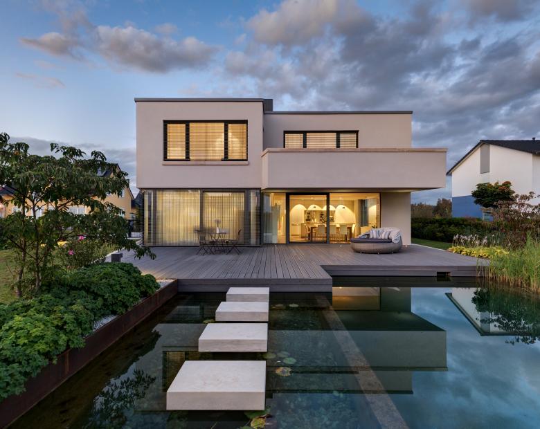 Im Süden wird die großzügige Terrasse durch einen Schwimmteich ergänzt. Über steinerne Trittplatten gelangt man trockenen Fußes zu den an der Südgrenze liegenden Freisitzen.