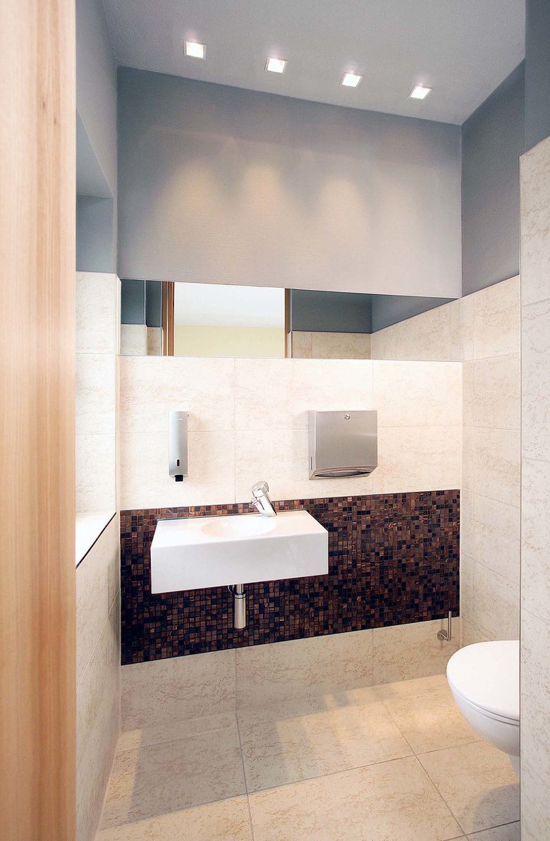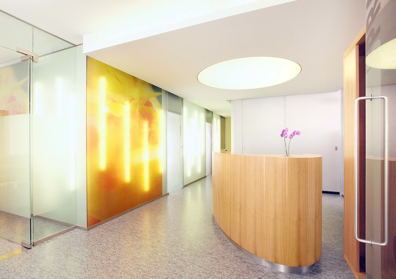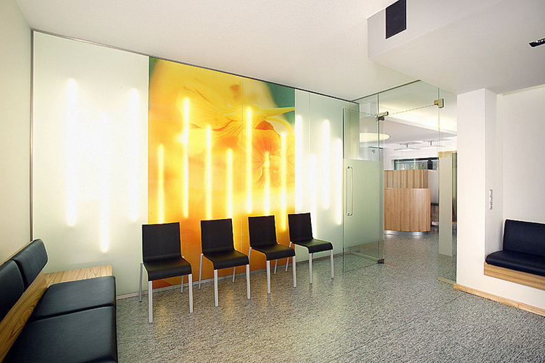 Es wurde ein großzügiger, zentraler Innenberiech geschaffen, der Transparenz bewirkt sowie verschiedene Ein-, Aus- und Durchblicke ermöglicht. Die Farben grau, weiß und ein schwarz-weißer Linoleumboden, eine klassische Materialkombination im Gesundheitsbereich, ist bei der Zahnarztpraxis in Eschenbach perfekt mit Holz, guten Formen und Proportionen kombiniert. Wenig dezente Kunst am Bau ergänzt die Gestaltung. Der gekonnte Material- und Formeinsatz zieht sich auch äußerst angenem bis in das "stille Örtchen" fort. Angenem vor allem, weil bei dieser Einrichtung auf so genannte "Designerware" verzichtet wurde.