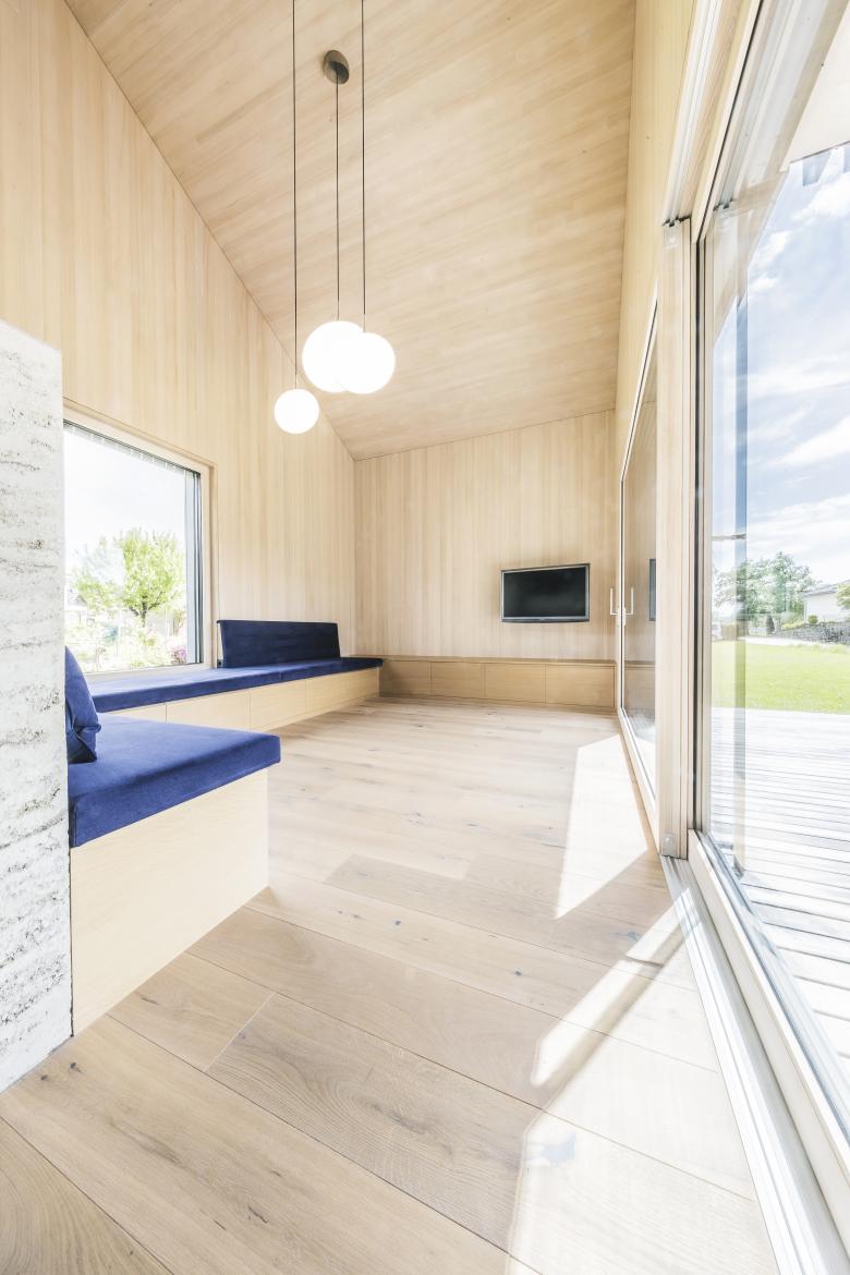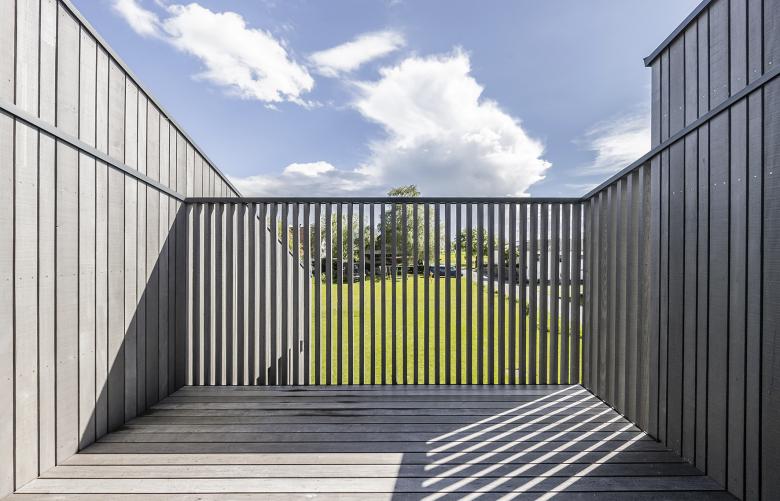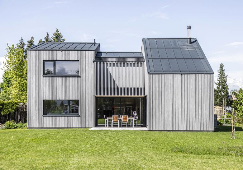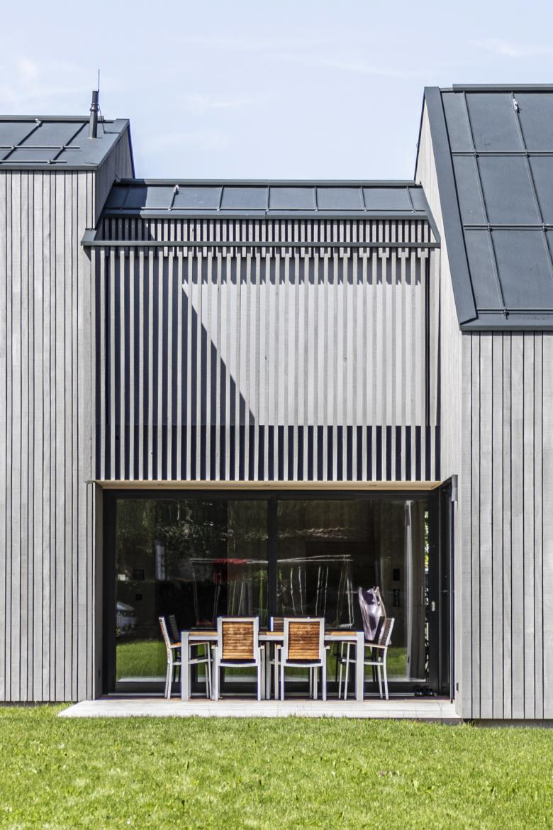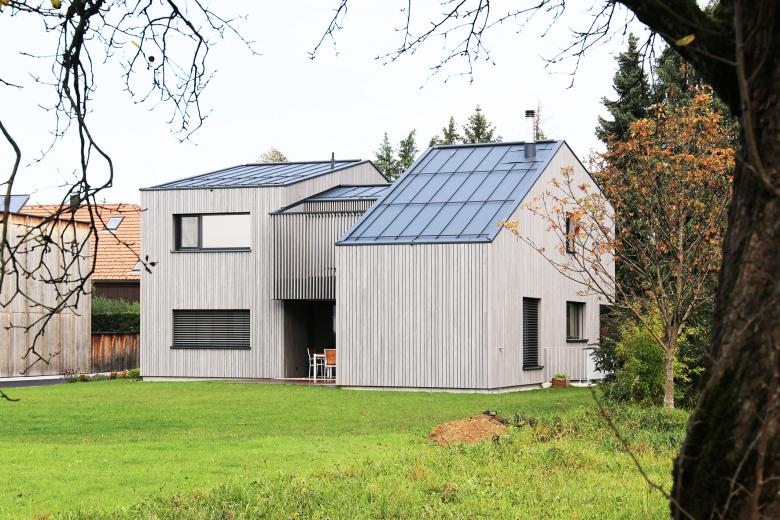 Im nördlichen Rheintal, am Ortsrand von Lauterach, liegt das Grundstück eingebettet in einer kleinteiligen Struktur von Einfamilienhäusern. In der dichten Bebauung positioniert sich der Baukörper eigenständig und fügt sich mit seiner dreiteiligen Kubatur stimmig in die Umgebung ein. Das Gebäude rückt von der Straße im Süden ab und orientiert sich in Nord-Südrichtung.