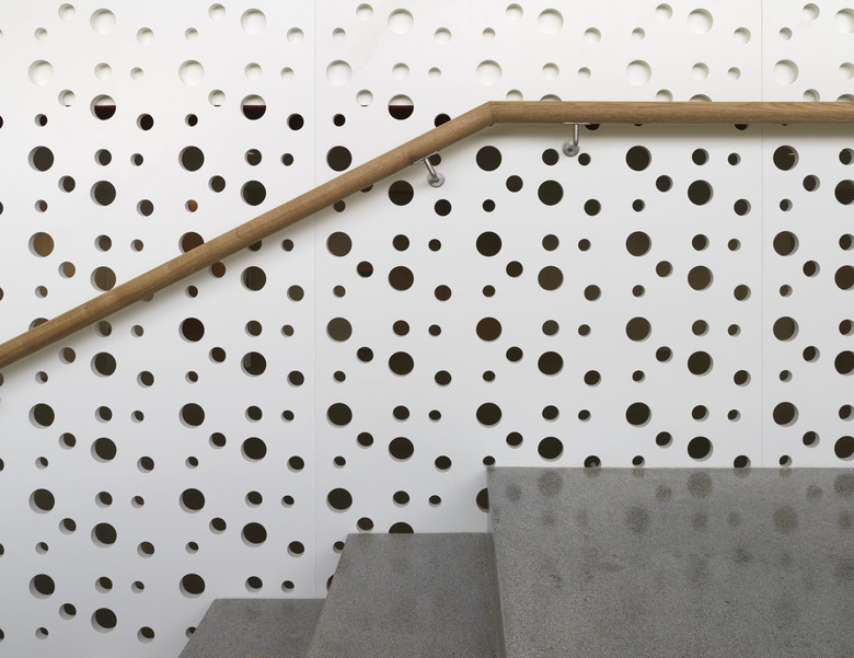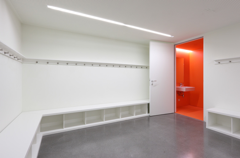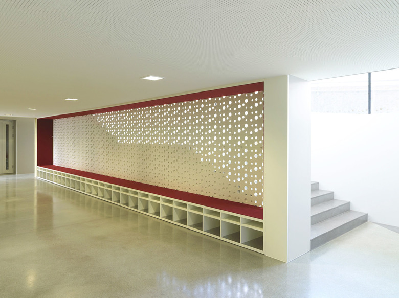 Die Sporthalle läßt sich von der großzügigen Aula aus überblicken und öffnet sich zur vorgelagerten Spielwiese. Der zweigeschossige Kindergarten stuft sich entlang des leicht abfallenden Hangs nach unten ab. Vom spielerisch gestalteten Gangbereich aus ergeben sich durch die unterschiedlichen Fenster auch für Kinder gut positionierte Ausblicke in die umliegende Landschaft.