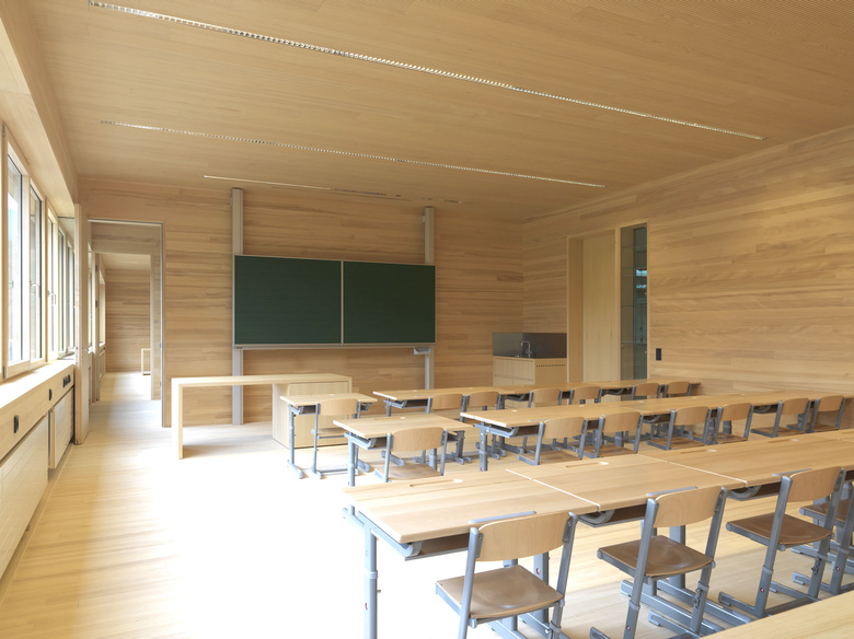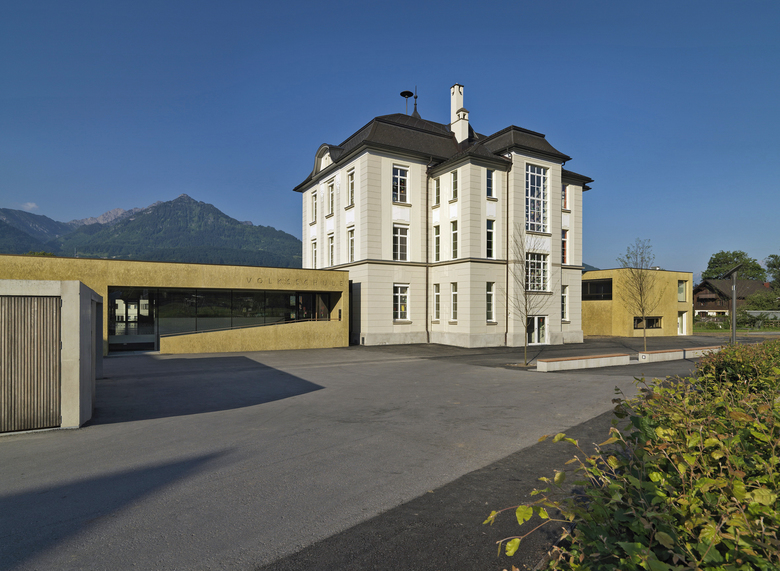 Das 100-jahre alte Schulhaus wurde komplett renoviert und bildet das zentrale Element des neuen Ensembles. Flankiert von den beiden bewußt flach gehaltenen neuen Baukörpern für Kindergarten zur einen und Volksschulerweiterung mit Sporthalle zur anderen ergibt sich ein, für alle nutzbarer, geschützter Freibereich um die alte Linde im Süden. Die OSB-Plattenschalung verleiht der ockerfarbenen Sichtbetonfassade ihre lebhafte Struktur. Im Innenraum dominiert die unbehandelte Weisstanne.