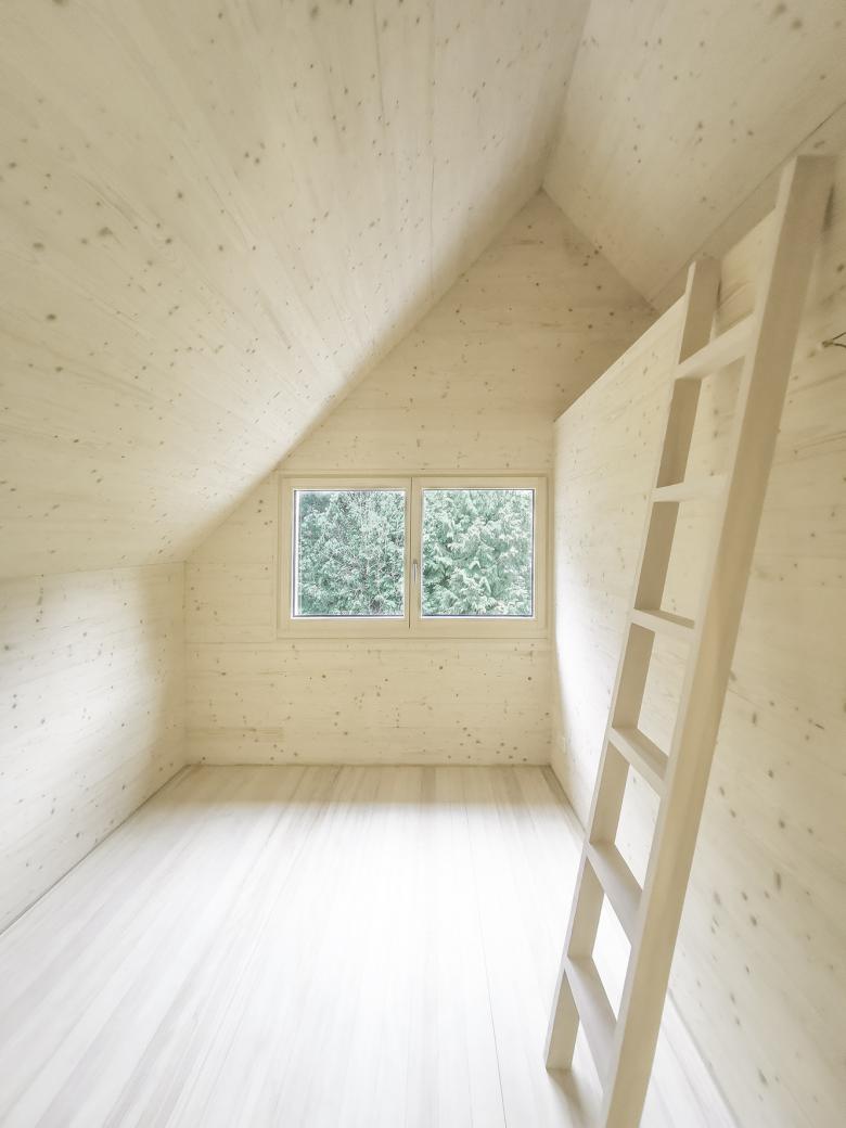 Das steile Satteldach bietet Raum für ein vollwertiges Obergeschoss. Dieses beherbergt drei Zimmer sowie ein Bad. Unter dem Giebel verschränken sich die Räume und bilden Hochebenen in den Kinderzimmern. Die bewusst positionierten Fenster ermöglichen den Ausblick in den Garten sowie Lichteinfall durch die Dachfenster in jedem Schlafzimmer.