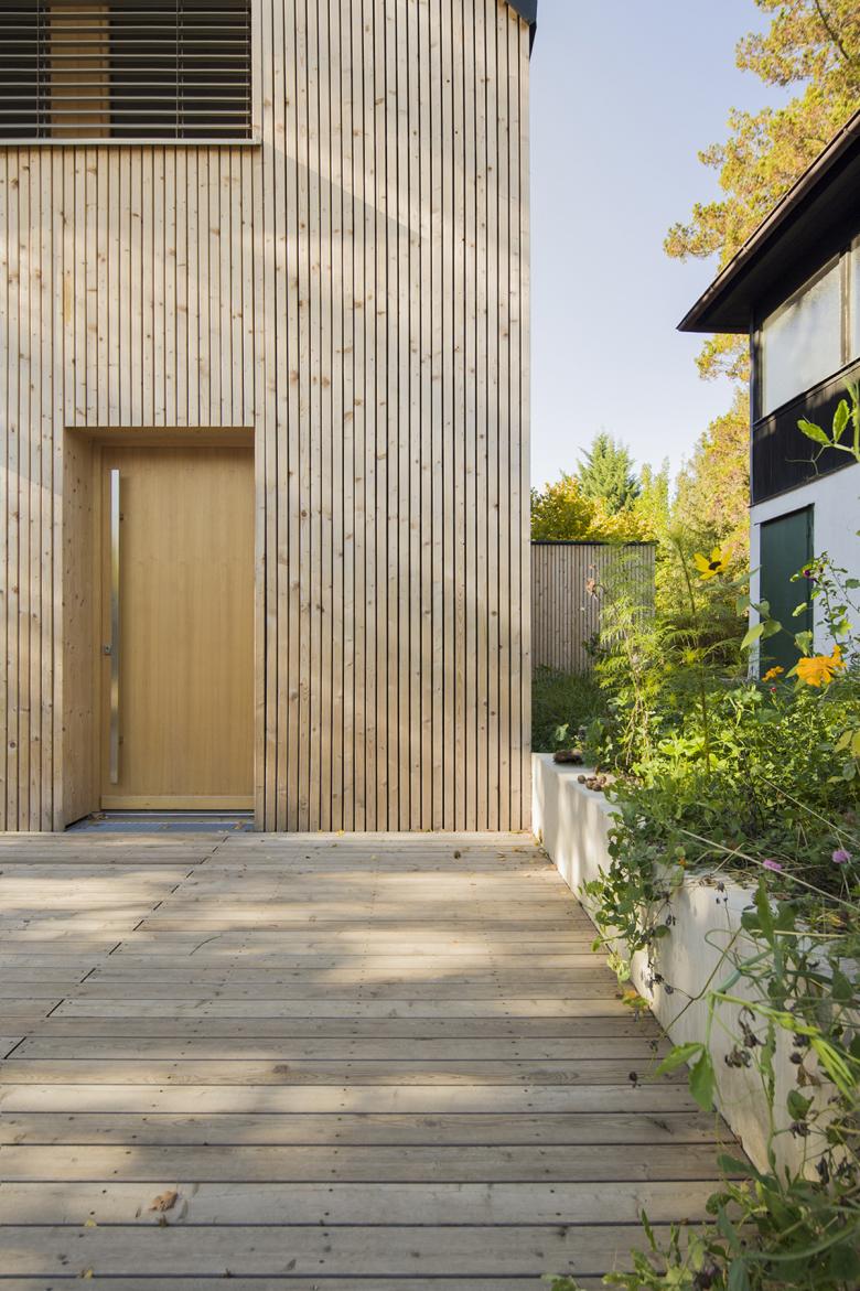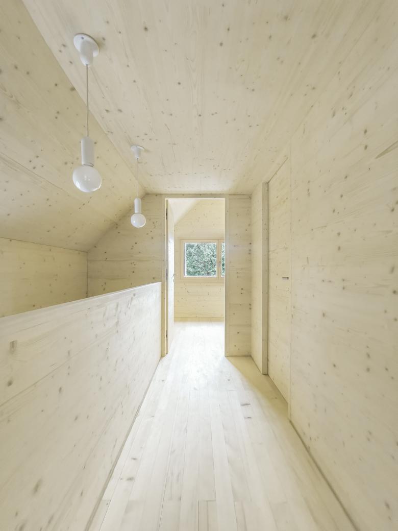 Holzoberflächen prägen das Äußere sowie das Innere des Gebäudes. Die Massivholzwände sind im Inneren als Sichtflächen belassen. Die vertikale Lattung aus Fichtenholz bildet die Fassade. Das Gebäude ist mit einer Luft-Wärmepumpe und einer südseitig in das Dach integrierten PV-Anlage ausgestattet.