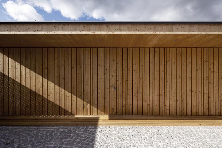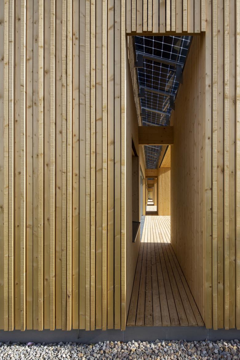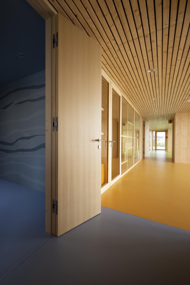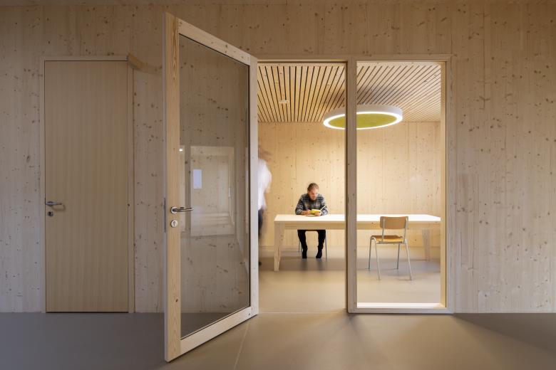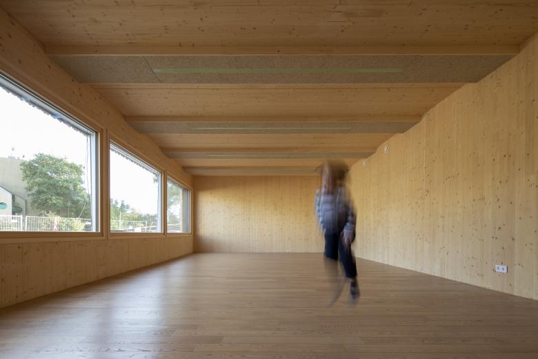The rhythm of the adjoining rooms is such that they can be manufactured and transported as prefabricated room modules. The rooms in between are proportioned in such a way that they can be spanned without supports with cross-laminated solid wood ceilings. In the choice of materials, special emphasis was placed on renewable and ecological building materials. Domestic spruce wood was used untreated and used in a wide variety of surface structures.