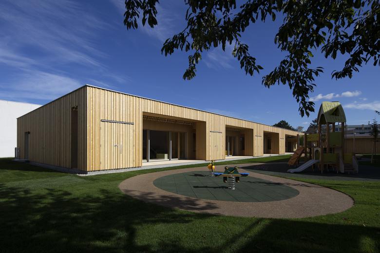 The kindergarten, built in solid wood construction, is a quiet, single-storey building in a heterogeneous environment. The eastern forecourt connects to the public space and leads to the entrance area, which forms a clear closure to the playground and gardens and thus serves as a visual and noise barrier.