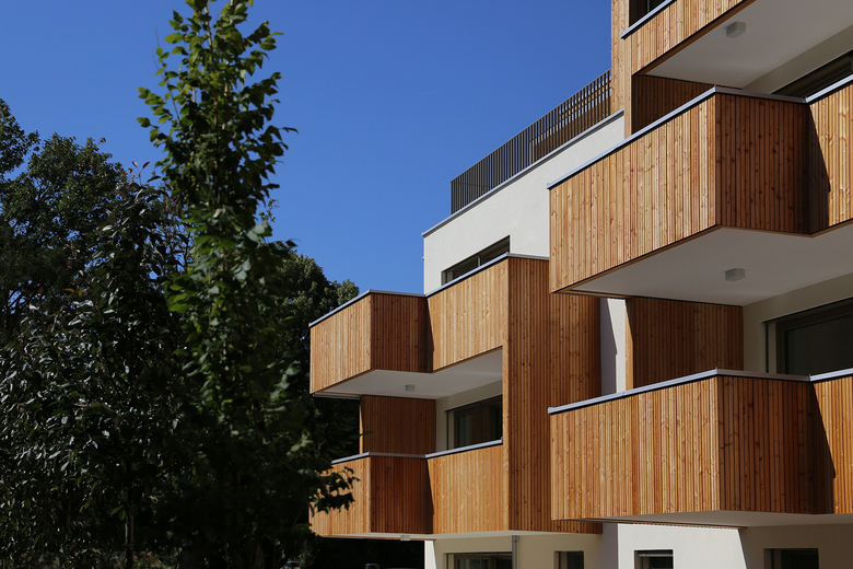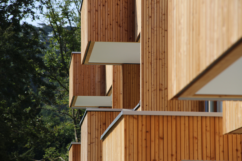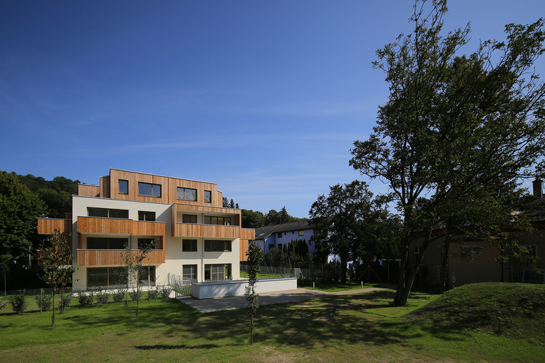Alle 20 Wohnungen verfügen über großzügige private Freibereiche mit Blick ins Grün. Die auskragenden Gebäudeteile sowie das Dachgeschoss sind in Lärchenholz verkleidet. Alle Dachflächen wurden begrünt. Der Heizwärmebedarf von 20,6 kWh/m²a entspricht Niedrigstenergiehausstandard. Eine große Solaranlage am Dach liefert Warmwasser aus Sonnenenergie.