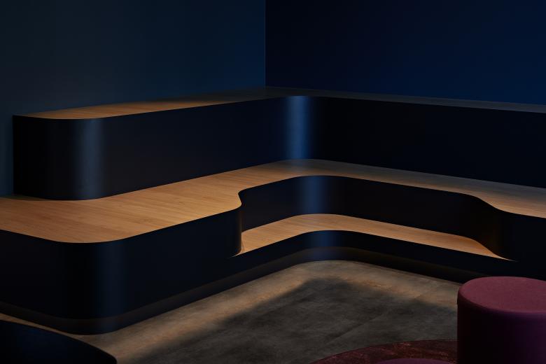 Abseits der klaren Linien und markanten Konturen, zeichnet sich der hintere Teil der Räumlichkeiten durch eine sanfte Formensprache aus, die eine warme Atmosphäre schafft. Hier finden sich verschiedene Nischen, die vielfältige Rückzugsmöglichkeiten bieten. Eine Auswahl an unterschiedlichen Sitzmöglichkeiten ermöglicht eine flexible Nutzung des Raumes. Die organisch gestaltete Sitztreppe fungiert nicht nur als funktionales Element, sondern auch als einladender Treffpunkt und zentrales Herzstück des Raumes.