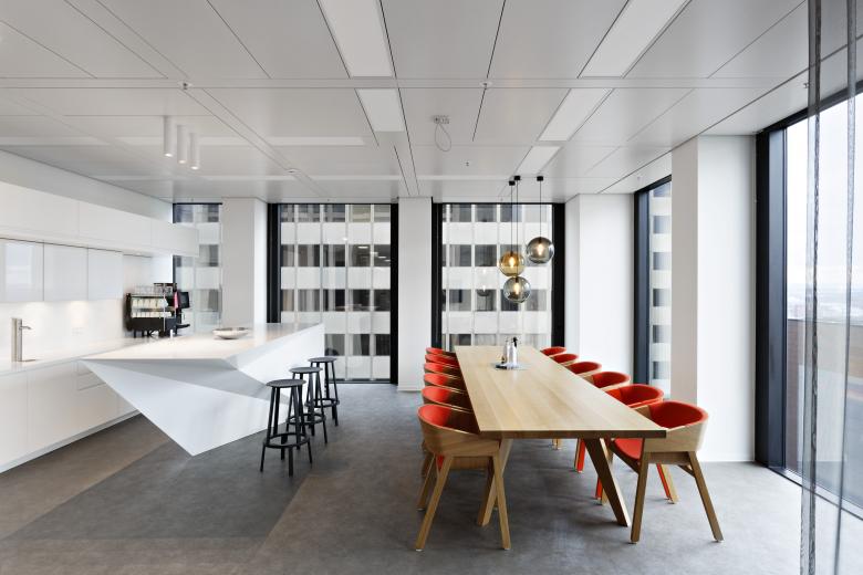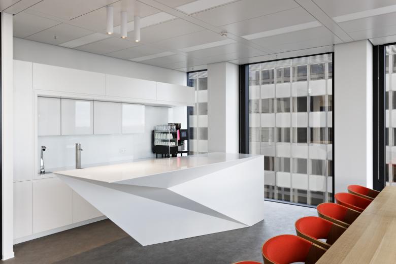 Wir haben den Alltag der Mitarbeiter neu gestaltet und kleine Teeküchen durch einen großen Coffee Point ersetzt. Dieser einzigartige Raum, der sich in einer Ecklage mit Skylinepanorama befindet, bietet mehr als nur eine Kaffeemaschine und Mikrowelle. Er ist in drei Zonen unterteilt und dient den Mitarbeitern als Rückzugsort, um Energie zu tanken und neue Ideen zu entwickeln. Ein eigens von uns entwickelter Stand-In-Tresen lädt zu einem schnellen Kaffee zwischendurch ein, ein langer Holztisch schafft Raum für gemeinsame Lunches, und eine Lounge, die durch Vorhänge abtrennbar ist, ermöglicht entspannte Gespräche. Eine kompakte Küche ist geschickt durch ein eingestelltes Möbel optisch und akustisch abgetrennt, sodass die Atmosphäre harmonisch und ruhig bleibt.