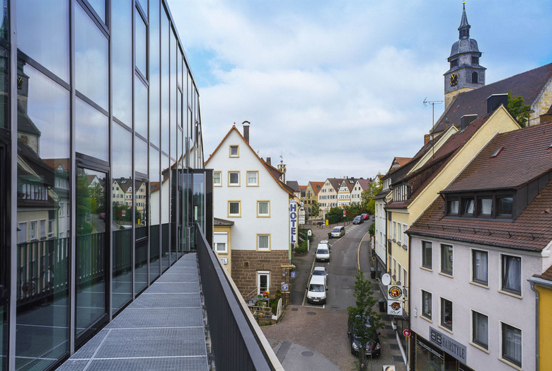 ecause of the special location with the dense neighbourhood and the corner position of the new building it was designed with the influence of the heights of the buildings around. So the house was inserted in a self-evident way: There are sections cutted out of the possible volume of a ashlar in the way that the edges have relation to the other roofs and eaves. The incised surfaces are translucent, the surface of the ashlar is consistently out of natural stone. The concept of the incisions was implemented from design to the detail