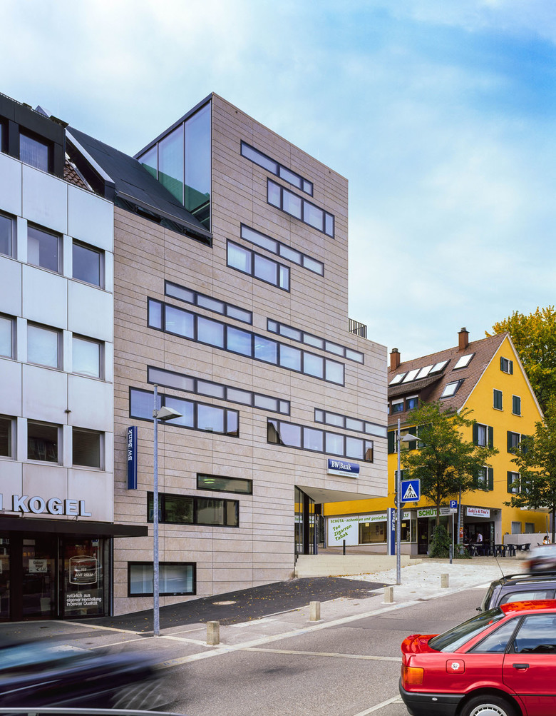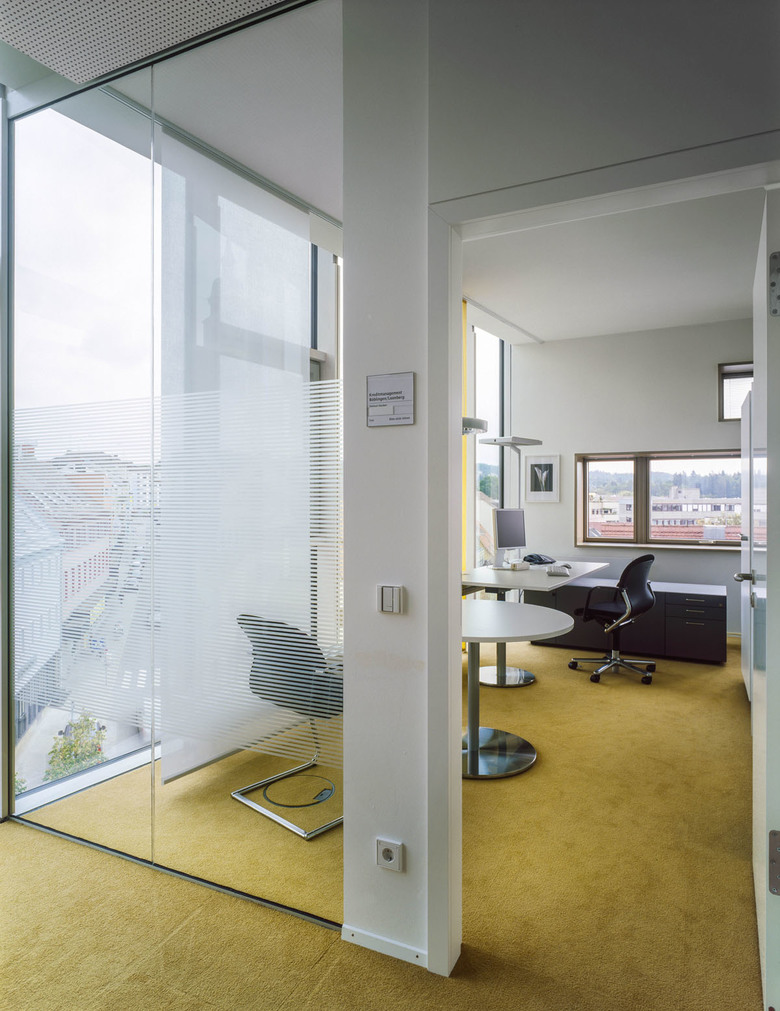 The entry is right at the most representative corner. In the ground floors there is the foyer with the automatic tellers and the customer's area with the service desk. From there every floor is reachable with the central elevator or the staircase. On the four floors above are mainly offices, conference and consultation rooms. In the basement are technical and store rooms and the safe