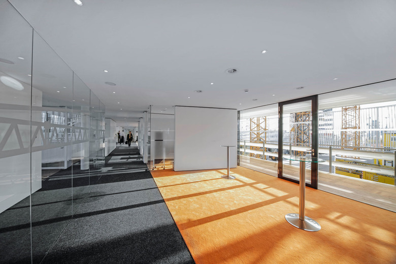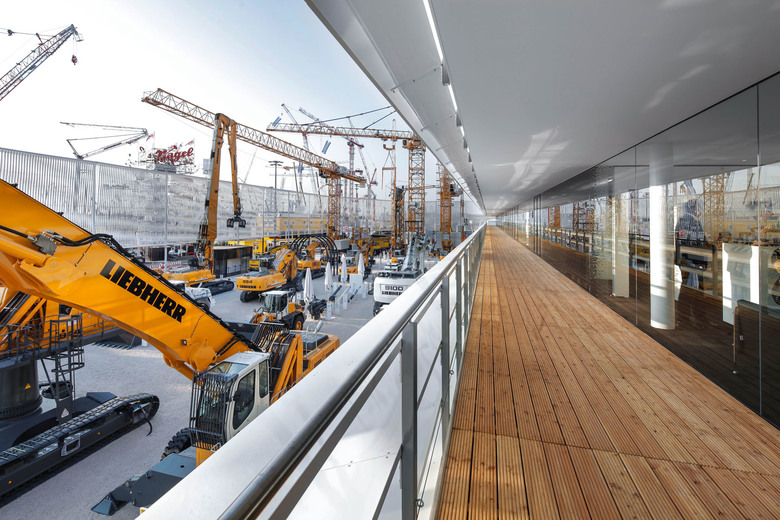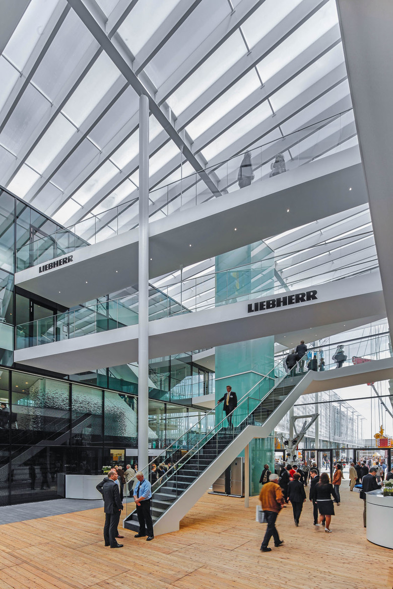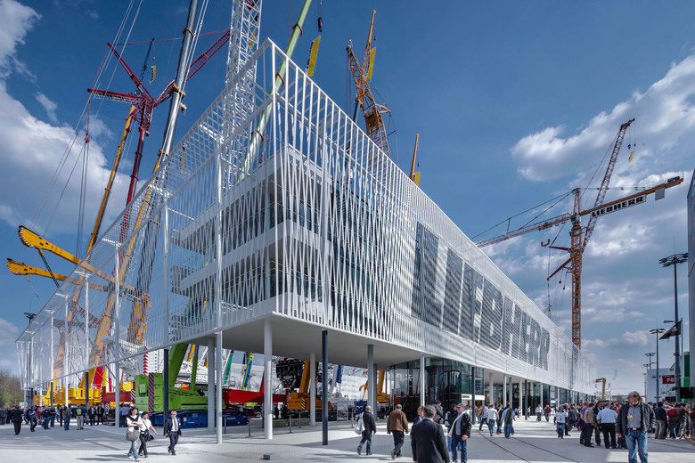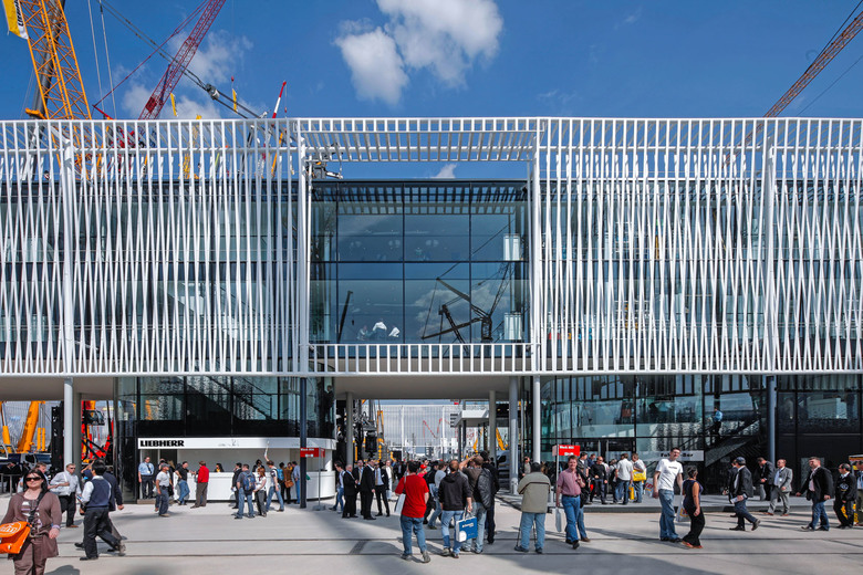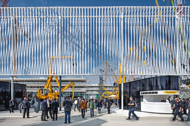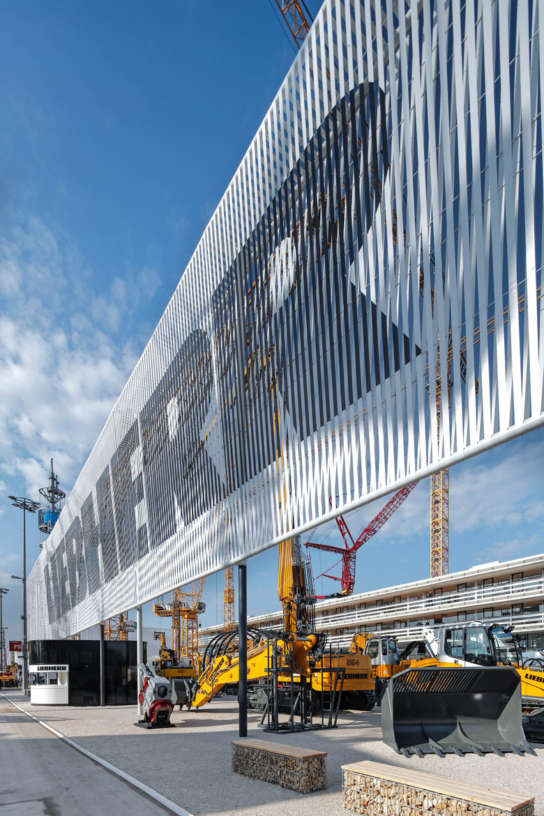 The building structure with all interior facilities arranged in two slim blocks running the full length of the site is integrated formally into the screen. Since these are raised on columns, the visitor approaching the stand has an unobstructed view across more than 13,500 square metres of display area and the many interesting construction machines exhibited there. Right where the blocks are crossing there is the main entrance and a plaza with special highlight exhibits.