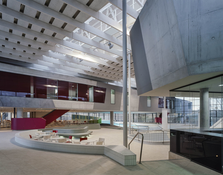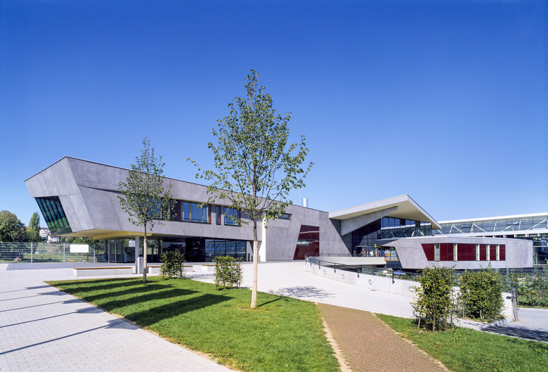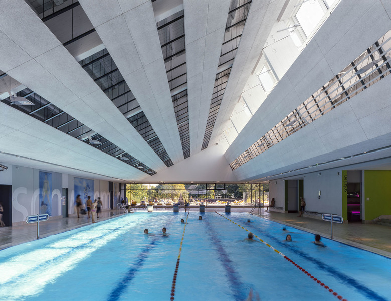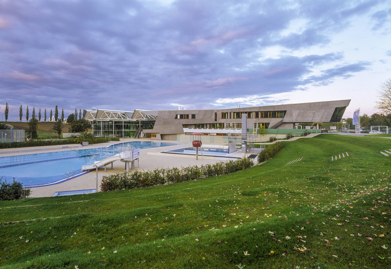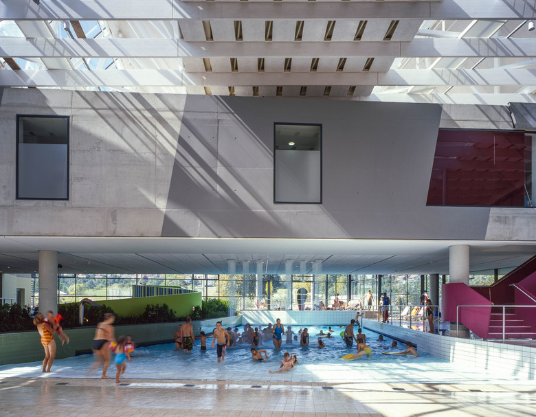 The landscape swimming area of the water park follows the natural slope topography of the exterior area. By floor-to-ceiling glazing which go easily interlock from the interior to the exterior. The swimming hall was enlarged to north from the existing building. The new building attains a maximum exposure and insolation from east and west and the orientation was reduced to the north. Significant south-sheds provide additional insolation. Various use areas such as restaurant, children's area, deck and rest area, different water areas and water attractions give the landscape differentiated atmospheres. Among other things, there is a wave pool, a flow channel, as well as several large slides. In addition to two tube slides - a black hole slide and a tire slide - there is a novel jump-street slide. The existing sports spa by the old Fildorado, with a 25-meter pool, the thermal pool in the outer area and sunbathing and relaxation area with tanning was de-bathing in the new landscape involved. Old and new merge into an interior single unit.