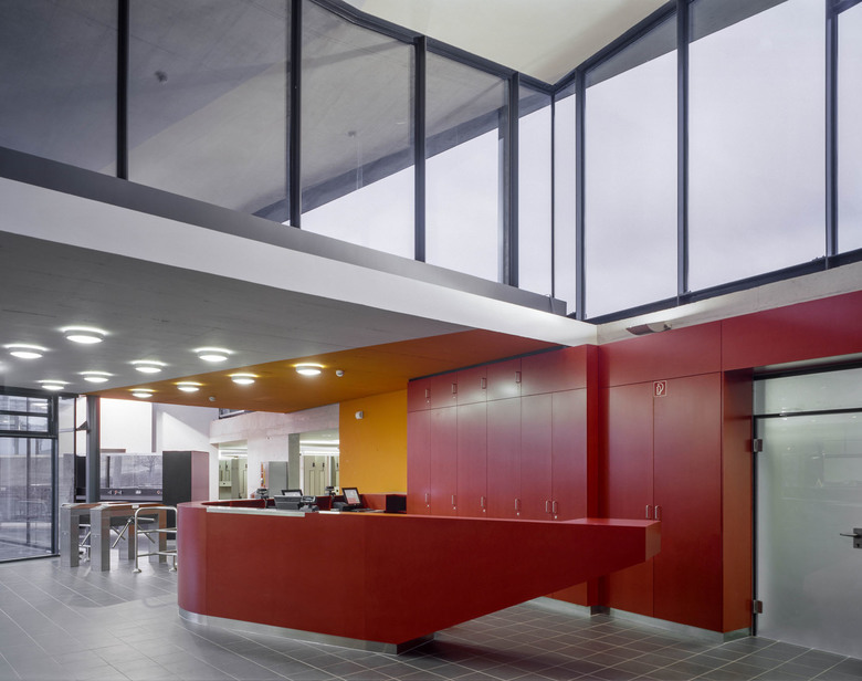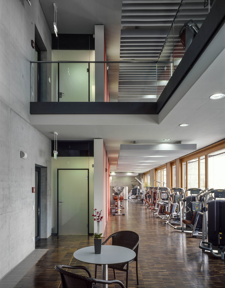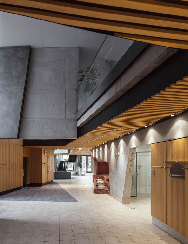 The new Fildorado is distinguished by a long bridge-like connecting element located on the west side of the property. It creates the link that connects the different parts of the new baths. At the same time, it still leads the visitor into the building where the new entry is located with all the serving functions (changing rooms, cashier, shops, office, kitchen and so on). This gesture of connection, development and maintenance frees the swimming and sport areas of functional constraints and serving parts. Leaving the foyer, which is the meeting point, the visitor arrives at the changing rooms that are “floating” bridge-like over the pool area underneath. In the north, the changing room area sticks out of the façade of the building. But the vast entry building also includes the access to a modern and exclusive fitness club over two levels with roof terrace and view over the outside pool areas in the North.