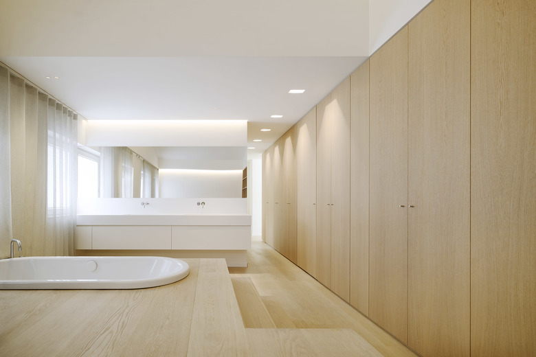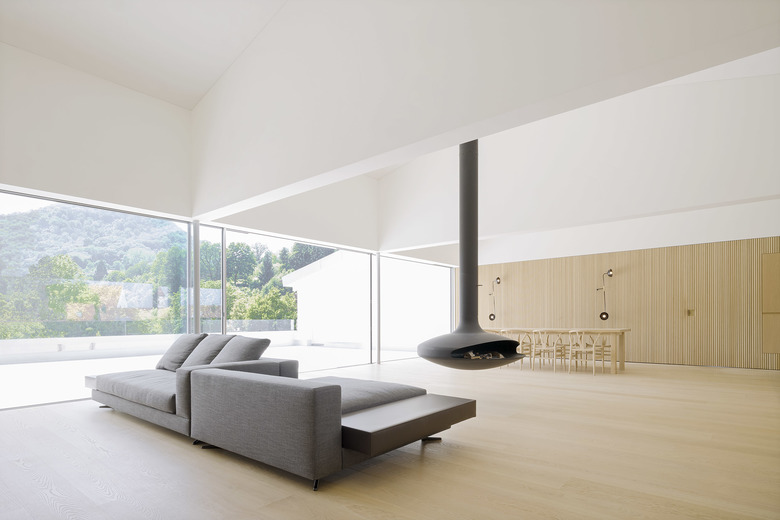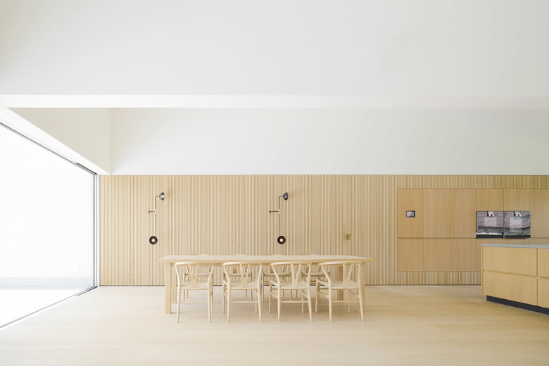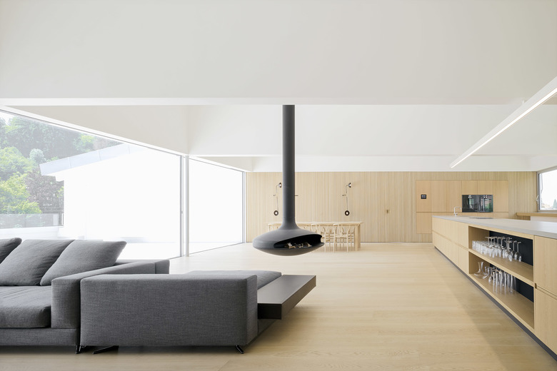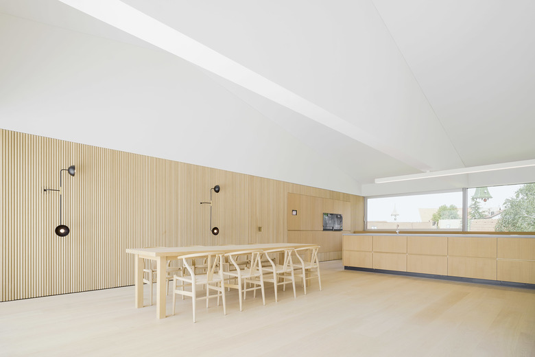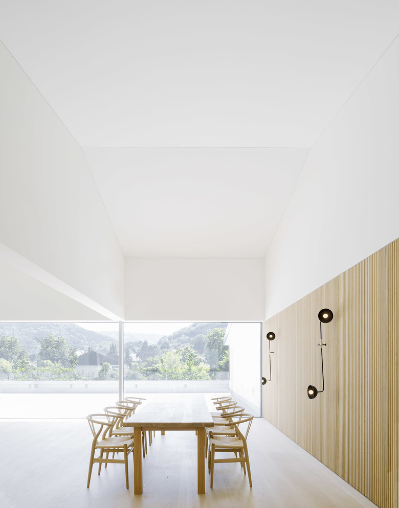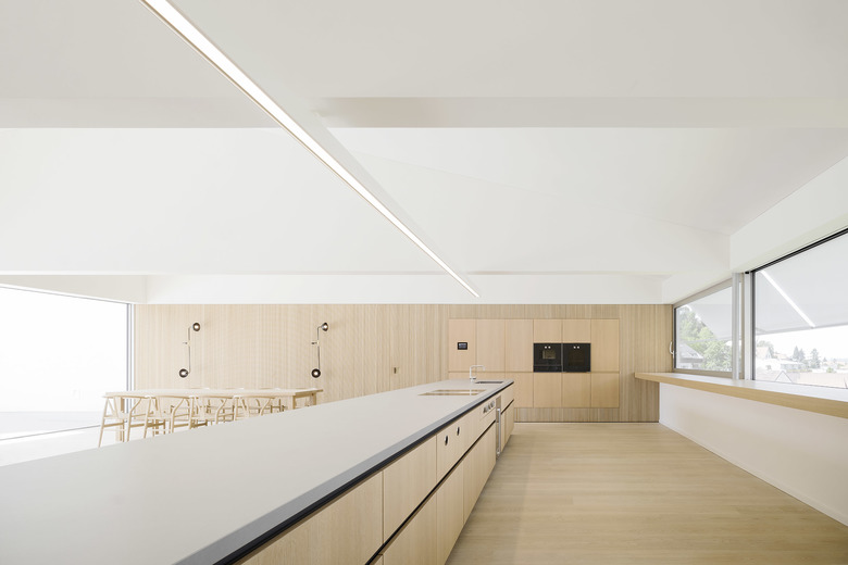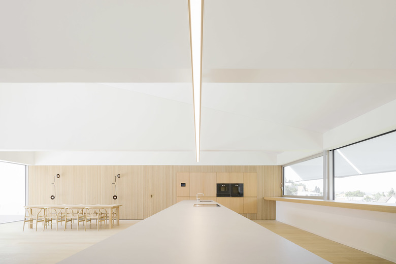 Nach Osten mit Morgensonne und Blick auf das Dorf wird am Tresen gefrühstückt und gearbeitet, im Tagesverlauf verlagern sich die Aktivitäten nach Westen Richtung Landschaft. Großflächige Schiebefenster zu beiden Seiten ermöglichen die Miteinbeziehung der Tages- und Jahreszeiten, der Tageslichteinfall kann über außenliegenden textilen Sonnenschutz gesteuert werden. Eine nach Westen vorgelagerte Dachterrasse erweitert die Fläche in den Außenraum.