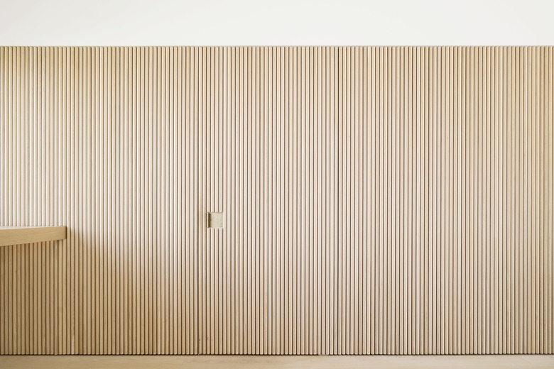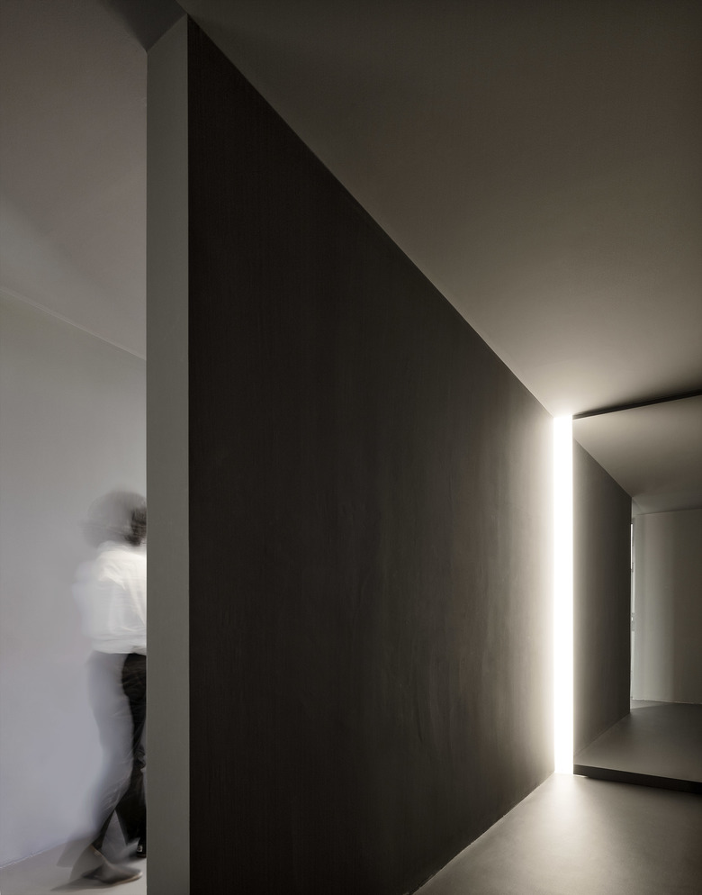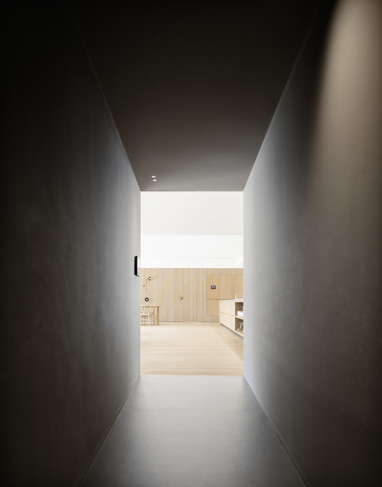 Die Erschließung erfolgt über einen vorhandenen Außenaufzug barrierefrei. Zur Beruhigung und Konditionierung der Sinne bildet ein „Dunkelraum“ den Auftakt und dient als Schwelle in die neu geschaffene Wohnlandschaft: ein Raum für Kochen Essen und Wohnen, zwei Seitentrakte mit Nebenräumen und Gästewohnung.