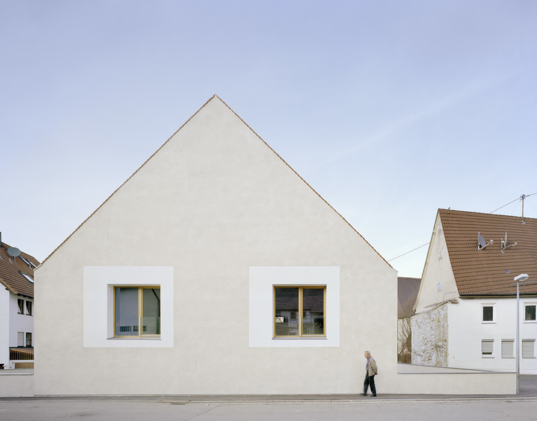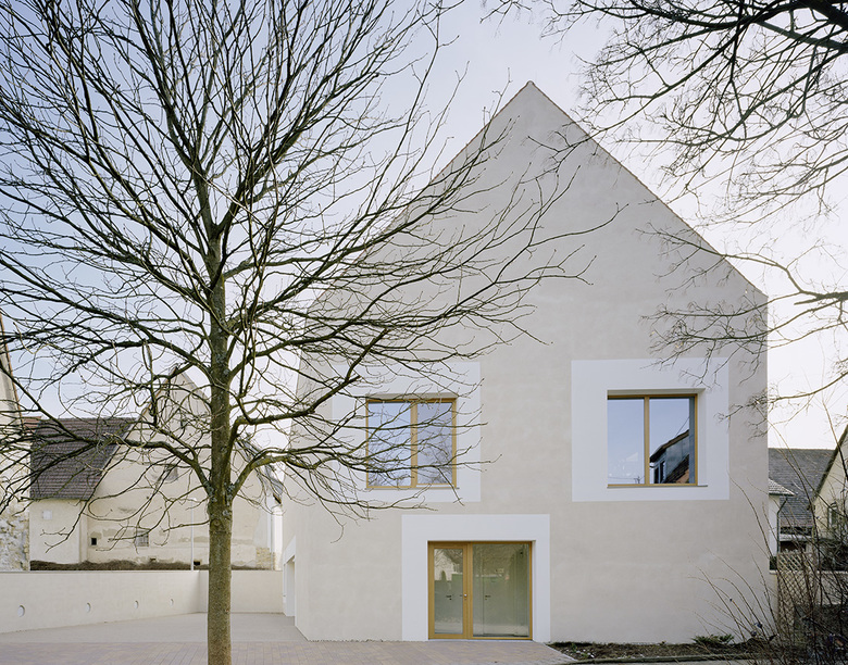 By architectonic interventions like the solid construction of the buildings volume and the size of openings in walls, habitual perception patterns are challenged and indicate the special use of the new parish hall in the village context. A steep roof with double plain tile covering and plastered walls establish references to rural and traditional building. Few large scale windows with trim moulding allow views in and out.
