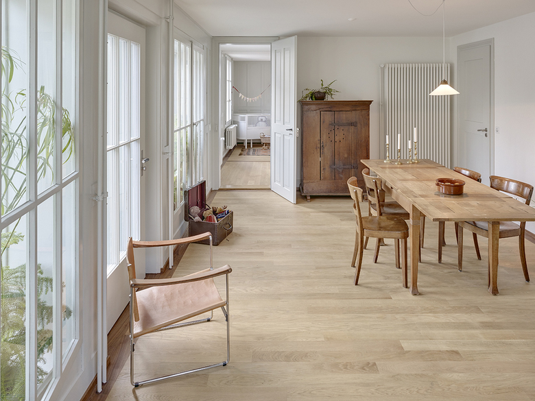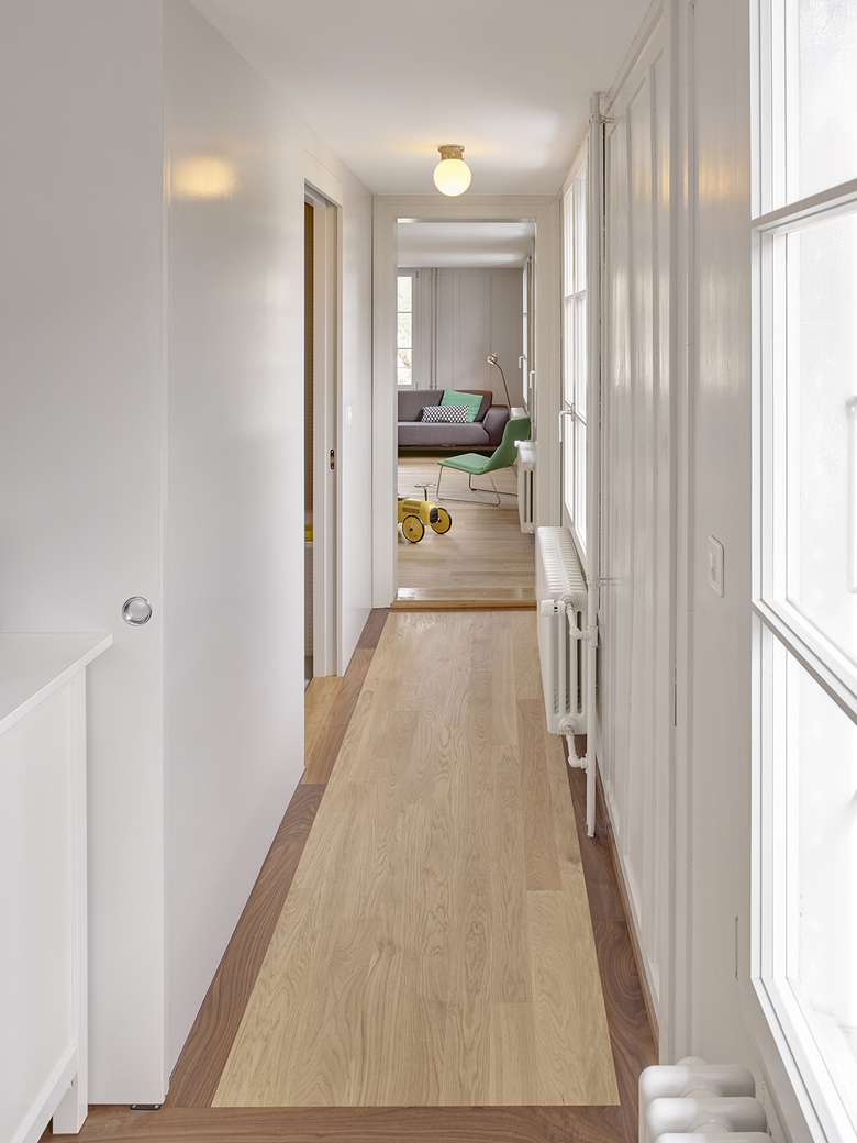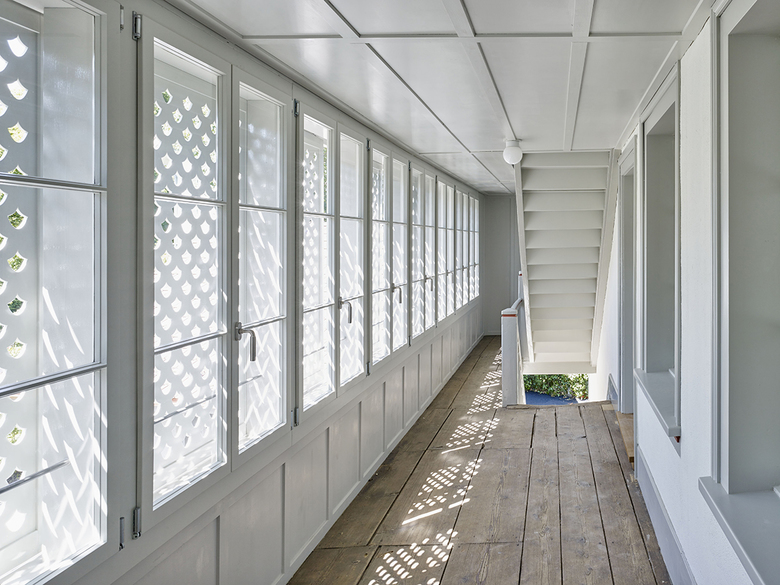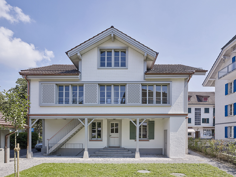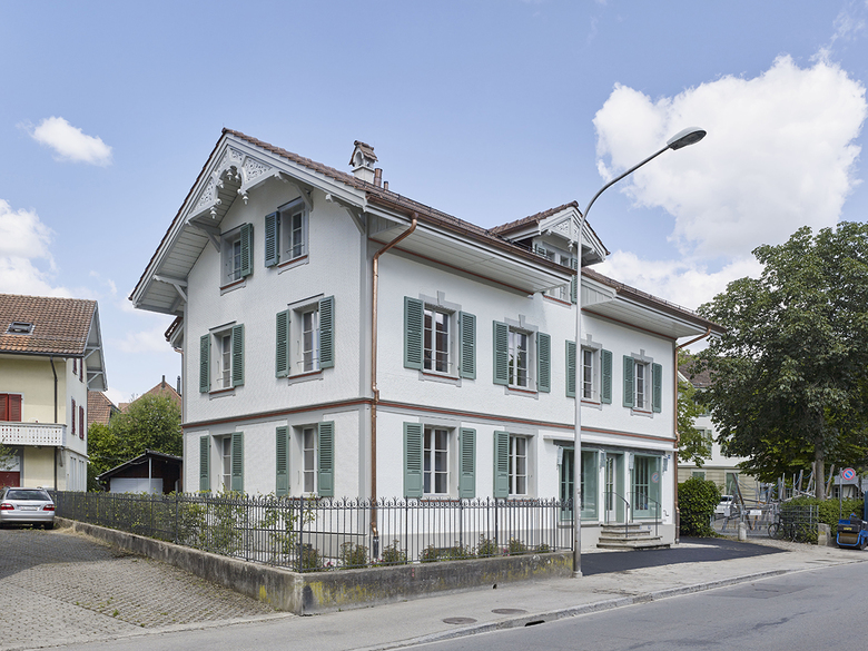 Der dreigeschossige, verputzte Riegelbau ist ein typischer Vertreter der Baumeisterarchitektur um 1890, der an die dörfliche Vergangenheit von Bümpliz erinnert. Das Haus verfügte ursprünglich über fünf Wohnungen, die mit ihren kammerartigen Grundrissen nicht mehr den aktuellen Bedürfnissen entsprachen. Mit der Zusammenlegung von zwei Wohnungen im Erd- und Obergeschoss konnte die bestehende schachbrettartige Typologie in eine kreuzförmige Figur transformiert werden. Küchen und Bäder liegen nun in deren Zentrum, während die Erschliessung entlang der Fassaden verläuft. Dadurch ist das Gebäude innenräumlich in seiner vollen Länge und Breite erlebbar. Das Dachgeschoss musste aus statischen Gründen in Richtung der quer verlaufenden Dachbinder unterteilt werden. Der Innenausbau orientiert sich konsequent am Bestand, Alt und Neu verschmelzen miteinander. Die neuen raumhohen Zimmertüren wurden in traditioneller Schreinerarbeit gestemmt ausgeführt, das Täfer entsprechend ergänzt. Das neue geölte Eichenparkett erinnert mit einem Fries aus Nussbaumholz an die einstige Kammerung. Die vorgelagerte Laube, die weiterhin der Erschliessung dient, erhielt zusätzliche Fenster und kann nun als besonnter Aussensitzplatz genutzt werden. Die Schindeleindeckung der Fassade wurde repariert und gestrichen, die neuen aussenliegenden Schiebeläden zitieren mit ihrer Lochung die ursprünglichen Schindeln. Das Projekt wurde 2016 mit dem Jurypreis Der beste Umbau prämiert.