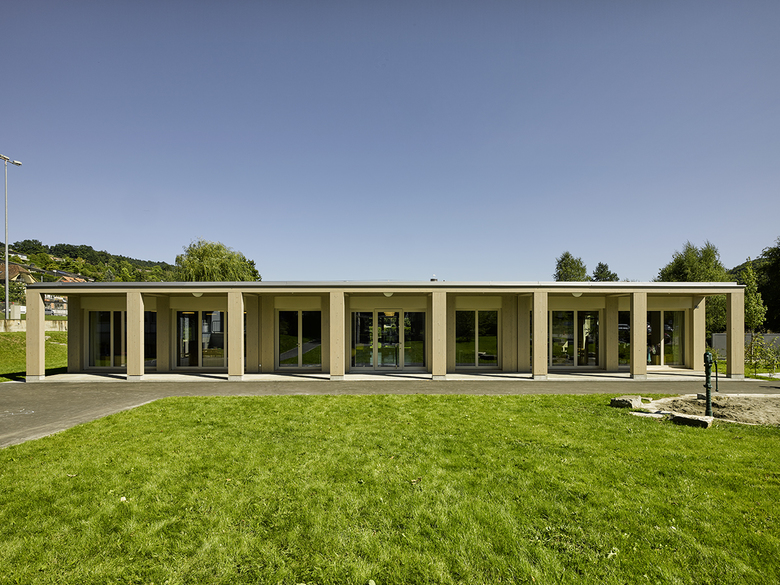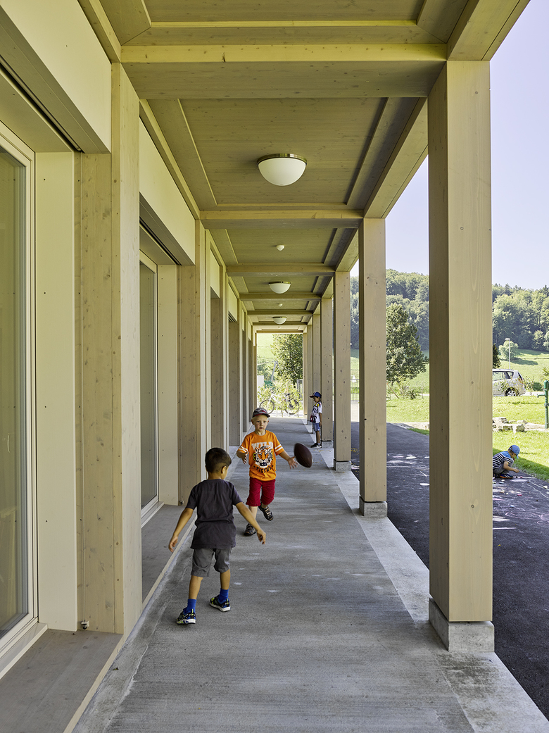 Der Neubau der Kindergartenerweiterung steht im Ortszentrum der Gemeinde Stettlen bei Bern und fasst städtebaulich zusammen mit den bestehenden Häusern „Bleiche“ und „Harlekin“ den gemeinsamen Aussenraum. Mit seiner vorgestellten Kolonnade erhält das als Holzbau konzipierte Gebäude neben einem wettergeschützten Aussenraum eine klare städtebauliche Orientierung weg vom angrenzenden Friedhof zum Spielbereich der Kindergartenanlage. Die anderen Fassaden zitieren mit ihrer Gliederung aus Lisenen und offenen oder geschlossenen Zwischenfeldern die Ordnung der Schauseite. Die Lasierung der Holzfassade variiert in ihrer Intensität je nach Tageslicht. Dadurch wirkt das Gebäude einmal hölzern, ein anderes Mal eher wie ein Steinbau, was durch die tektonische Gliederung unterstützt wird. Zwei Kindergartengruppen finden im Gebäude Platz, deren Räume über einen mittig liegenden Garderobenraum erschlossen werden. Hier befindliche Garderoben und Waschtröge sind in Nischen eingebaut und lassen die Wände raumhaltig erscheinen. Über einen Korridor gelangt man durch eine aus Nebennutzungen bestehende Raumschicht in die aussenliegenden Klassenräume. Diese sind dreiseitig belichtet und bestehen aus einem Hauptraum mit eingebauter Küchenzeile, sowie einem Gruppenraum, der durch Schiebetüren abgetrennt und für separate Aktivitäten genutzt werden kann. Grau lasierte Dreischichtplatten geben den Räumen eine helle Atmosphäre, das geölte Eichenparkett vermittelt Wohnlichkeit und Wärme.