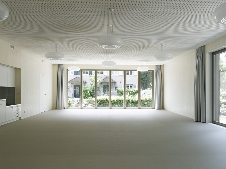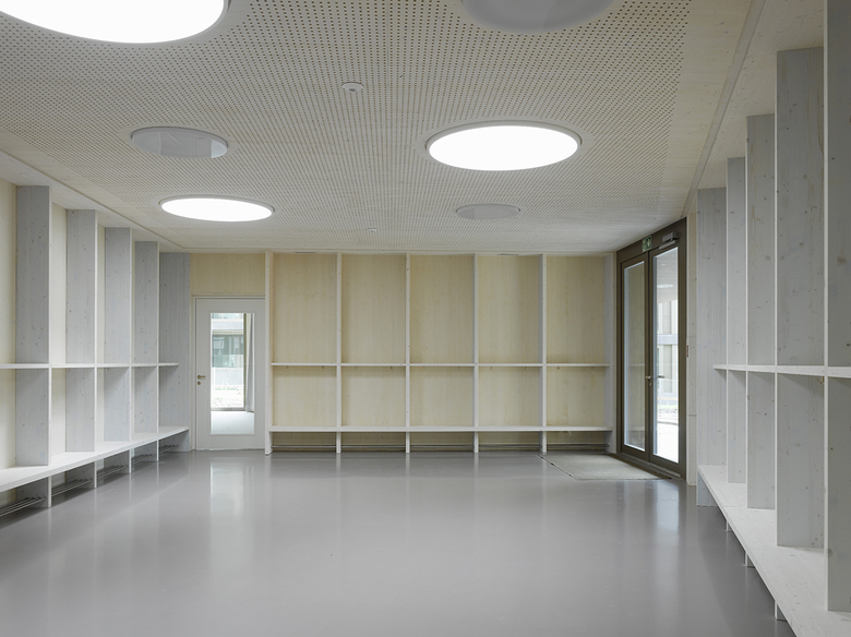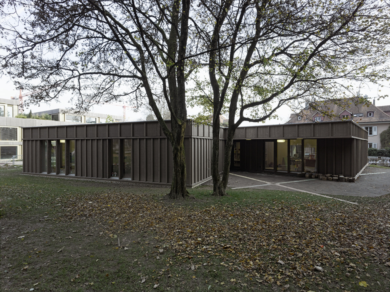 Der 2013 fertiggestellte Doppelkindergarten befindet sich an der südöstlichen Ecke der Parkanlage Schönberg in Bern und ersetzt einen schadstoffbelasteten Bau aus den 1950er-Jahren. Der zweiflüglige Holzbau entwickelt seine Figur aus den Abstandslinien sowie der Verschmelzung zweier identischer Volumina, an deren Schnittstelle sich ein zentraler Garderobenraum bildet. Seine braun lasierten Fassaden sind als Rahmenelemente vorfabriziert und auf der Baustelle beplankt. Kräftige Deckleisten, die an den Elementstössen befestigt sind, rhythmisieren die Fassade gleichmässig. So wird der Ausdruck des Gebäudes weg von einem gemeinen Holzbau zu einer tektonischen Erscheinung verschoben, die sich im Bereich der Fenster zu einer lastabtragenden Struktur aus Pfosten entwickelt. Das Thema nimmt der Garderobenraum im Inneren wieder auf. Hier erhalten die Leisten eine räumliche Tiefe, zwischen denen sich eine Garderobe für jeweils zwei Kinder bildet. Der von oben belichtete Raum ähnelt in seiner polygonalen Form dem Äusseren des Gebäudes und bildet, ähnlich einem Vorplatz, den Auftakt zu den beiden Klasseneinheiten, welche aus einem grossen Klassenzimmer, einem Gruppenraum und verschiedenen Nebenräumen bestehen. Die orthogonale Raumgeometrie, die hell lasierten Dreischichtplatten und die dreiseitig angeordneten Fenster, die viel Licht hereinlassen, verleihen den Räumen ein ausgeglichenes, konzentriertes Erscheinungsbild. Es unterstützt den Schulbetrieb und steht zugleich der bewegten Form der Garderobe sowie dem Äusseren des Gebäudes spannungsvoll gegenüber.