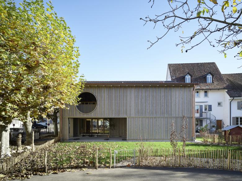 Der Neubau ist ein vorfabrizierter Holzbau mit Fassadenverkleidung aus Holzbrettern mit Nut- und Kamm, die zwischen einer horizontal und vertikal laufenden Struktur aus Kanthölzern montiert wird. Die Fenster sind im gleichen Raster unterteilt wie die gesamte Fassade, so dass leicht bedienbare Fensterflügel und Festverglasungen mit ökonomischen Scheibengrössen entstehen. Die Lüftungsflügel für die Nachtauskühlung sind im Fassadenraster integriert. Die Fassadenverkleidung ist bei den Flügeln der Nachtauskühlung perforiert und gewährleistet so den Einbruchschutz im Erdgeschoss. Die Fassade ist mit einer dunklen Verwitterungslasur behandelt, ähnlich einer verwitterten Holzfassade, wie sie der bestehende Schopf an gleicher Stelle auf dem Areal aufwiesen hatte. Das Dach ist mit Ziegeln eingedeckt, analog den Nachbarhäusern im Bestand.
