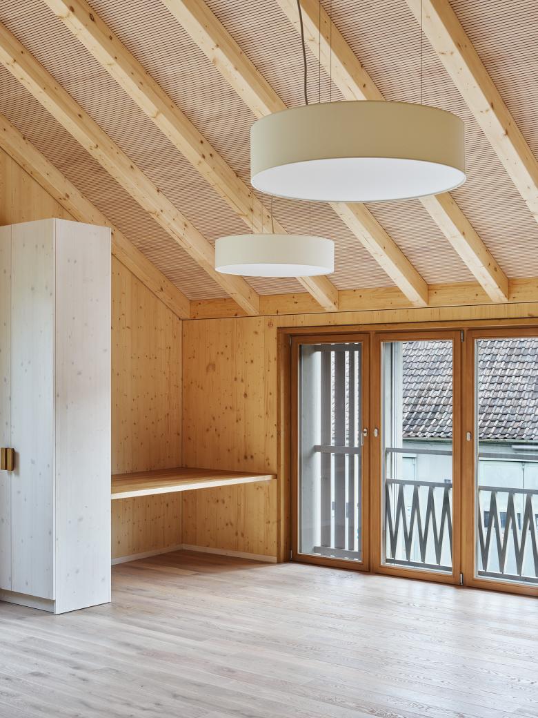 Die Farbigkeit innerhalb des Hauses wird geprägt durch die natürlichen Materialien von den Holzböden und Wänden. Durch unterschiedliche Holzlasuren entsteht im Innern ein Spiel von leicht differenzierten, natürlichen Holzfarbtönen. Die Fassade wird geprägt durch die Farbigkeit des vorverwitterten Holzes, welche das Haus im Kontext verortet.