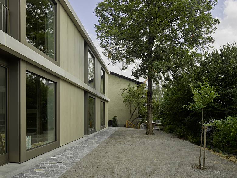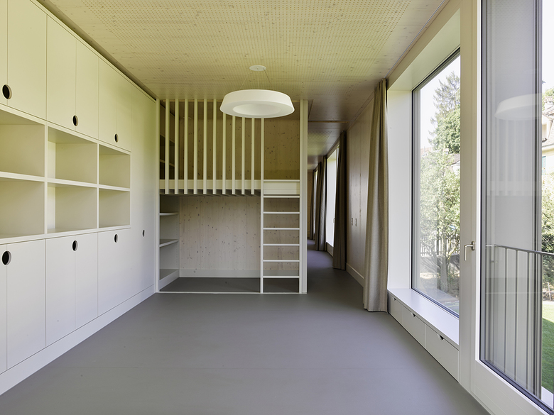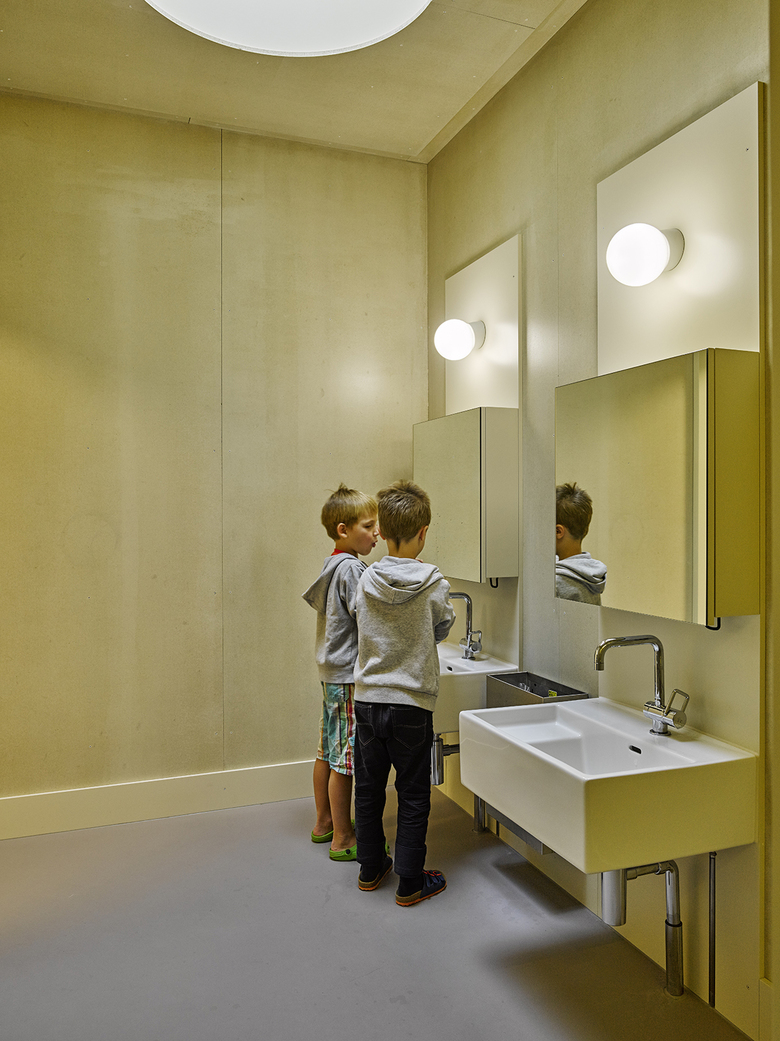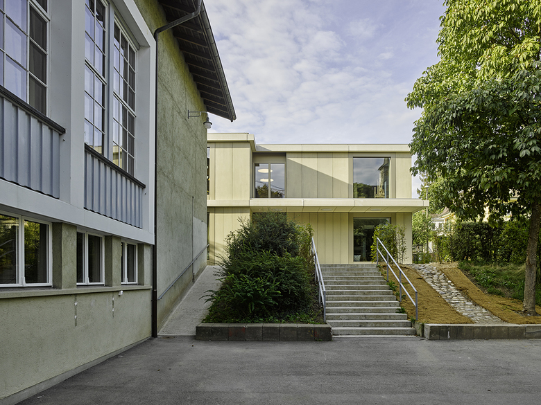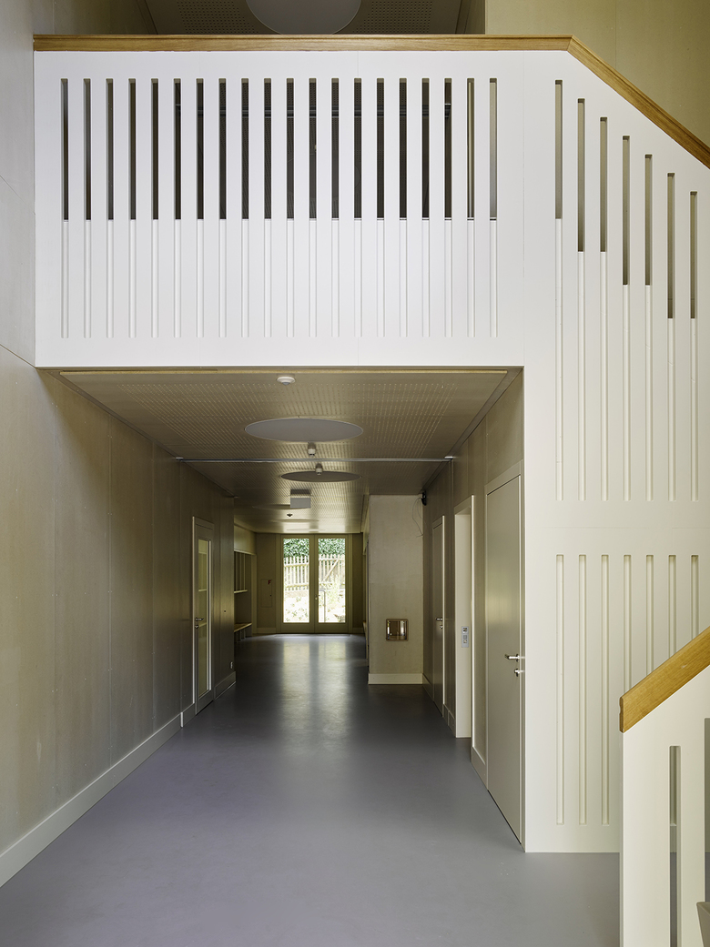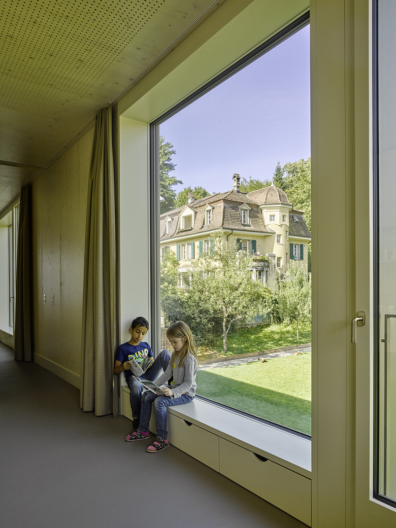 Der Neubau stellt nach der Turnhalle und der Aula die dritte Erweiterungsetappe der ursprünglich 1868 vom Architekten Eugen Stettler entworfenen Volksschule Sulgenbach dar. Das zweigeschossige Gebäude, das vier Klassen der Basisstufe Platz bietet, zitiert mit grossformatigen Fenstern und den kräftigen Gesimsen den historischen Bestand. Die graugrüne Farbigkeit der Fassade erinnert an den regionalen Sandstein, der bei vielen öffentlichen Bauten in Bern Verwendung findet. Erst die vertikalen Fugen verraten, dass es sich um einen Holzbau handelt, dessen Fassaden aus lasierten Duripanelplatten und Gesimselementen aus Glasfaserbeton gefertigt ist. Die Duripanelplatten finden sich im Inneren ebenso in der Erschliessung und den Nebenräumen. Die Klassenzimmer werden dafür durch lasierte Dreischichtplatten differenziert, die halbtransparente, hölzerne Materialität der Wände steht in mildem Kontrast zu den deckend gestrichenen Einbauten. Abgesenkte Küchenarbeitsflächen übernehmen den kindlichen Massstab, Sitznischen in den Fenstern laden zum Verweilen ein. Ein baumhausähnliches Hochbett in jedem Gruppenraum dient den Kindern als Rückzugsort. Alle Räume besitzen einen warmen, wohnlichen Ausdruck so auch das hohe Foyer mit der dreiläufigen Treppe, die das Obergeschoss erschliesst. Mit ihren handwerklichen Details, einem profilierten Handlauf aus geölter Eiche und den perforierten, hölzernen Brüstungen, wirkt die Treppe wie ein eingestelltes Möbel. Die Entstehungszeit des Gebäudes war kurz: Es wurde in nur 16 Monaten geplant, bewilligt und gebaut.