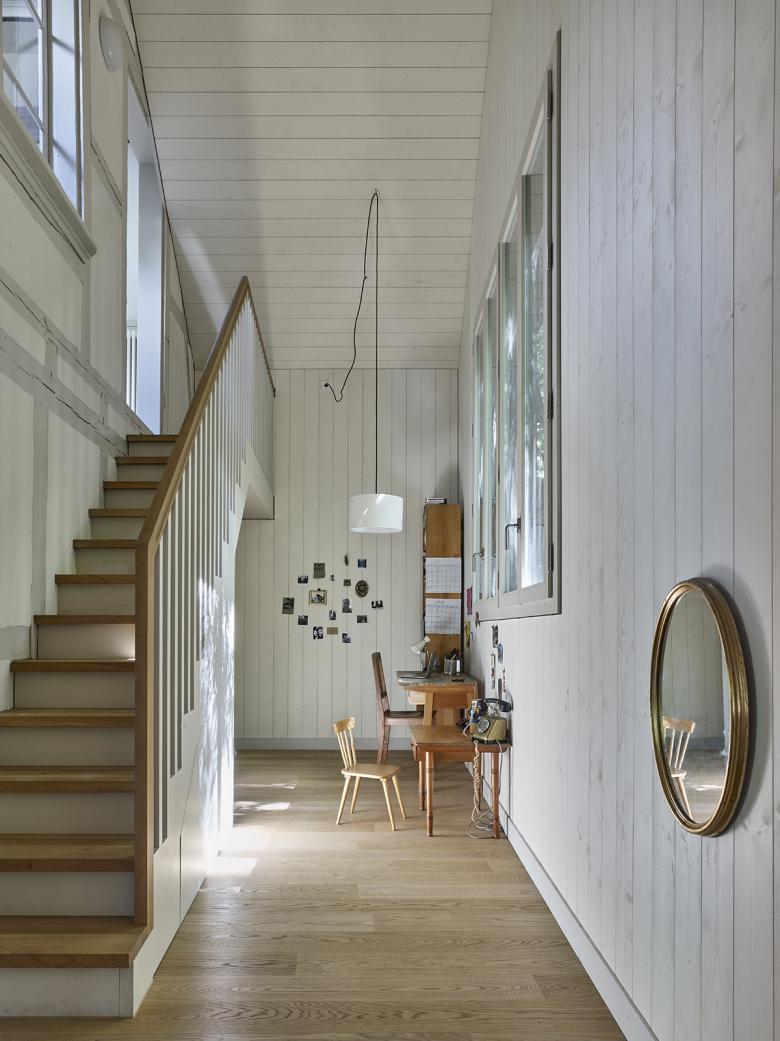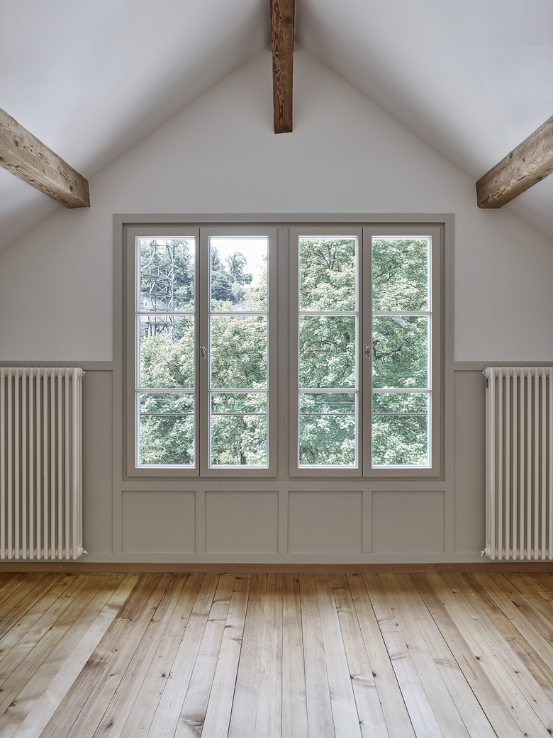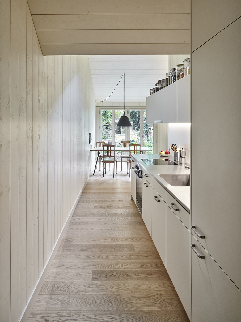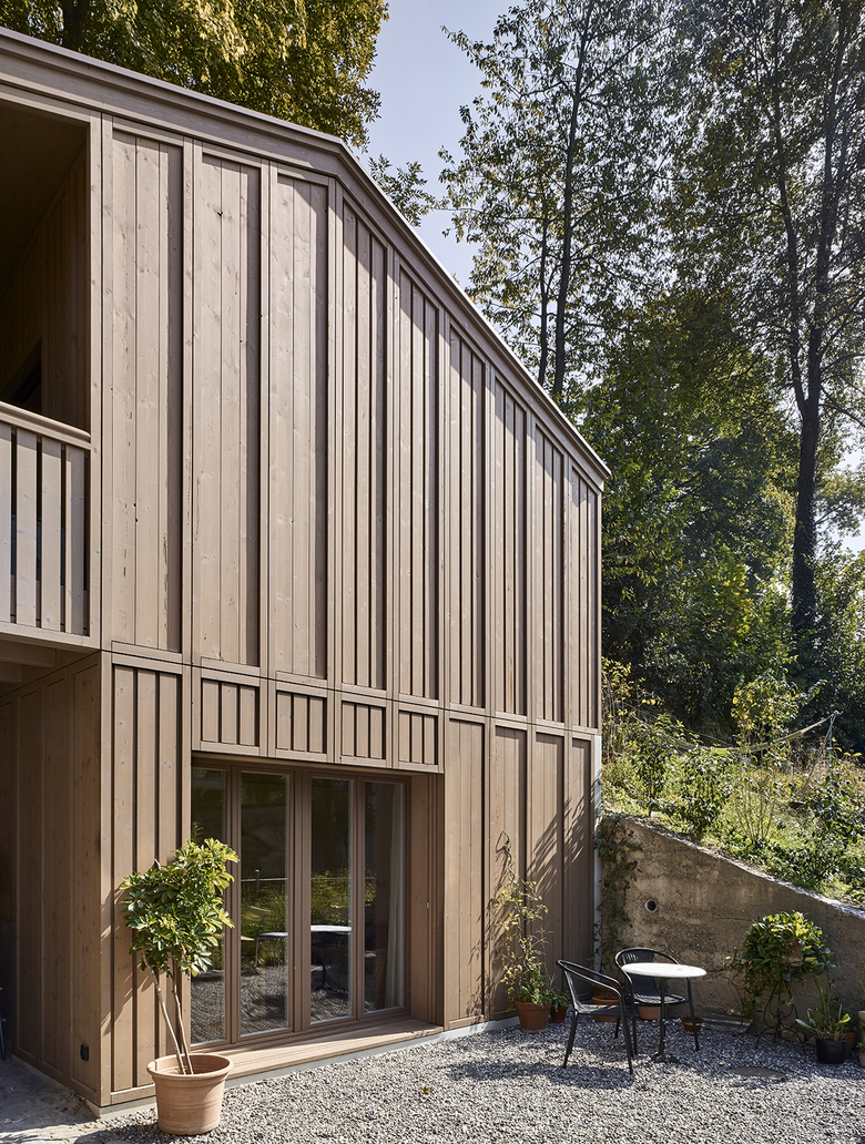Wegen der kleinteiligen Struktur wurden im kreuzförmig unterteilten Altbau-Grundriss die Schlafräume und Nasszellen angeordnet, während im offenen und grosszügigen Raum des Anbaus das Wohnen, Kochen und Essen stattfindet. Das Entrée verbindet über eine Öffnung in der ehemaligen Fachwerkfassade den Altbau- mit dem Neubaubereich. Trotz des im Erd- und Obergeschoss fast identischen Grundrisses schaffen die auf die Topografie reagierenden Fensteröffnungen und die Dachform in der Erweiterung unterschiedliche, einzigartige räumliche Bezüge und Stimmungen. Am Ort der früheren Laubentreppe führt eine neue Treppe in das Dachgeschoss, wo sich neben dem Vorraum auch ein grosses Schlafzimmer und eine Dusche befinden. Zusätzlich zu den gedeckten Eingangsbereichen der Laube haben beide Wohnungen einen eigenen Aussensitzplatz erhalten.