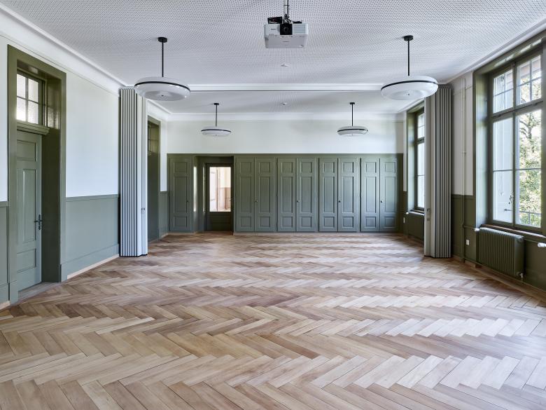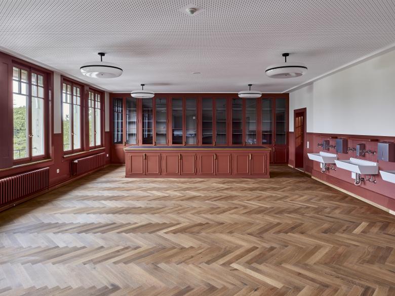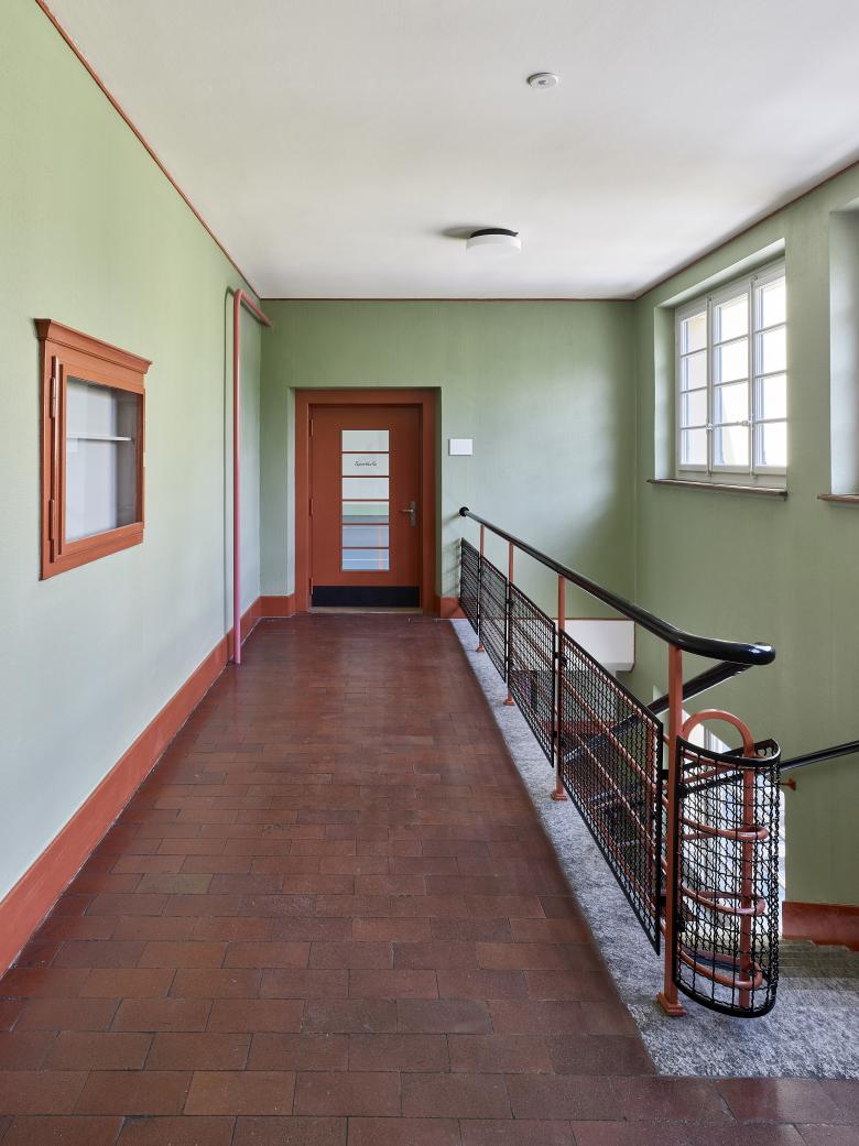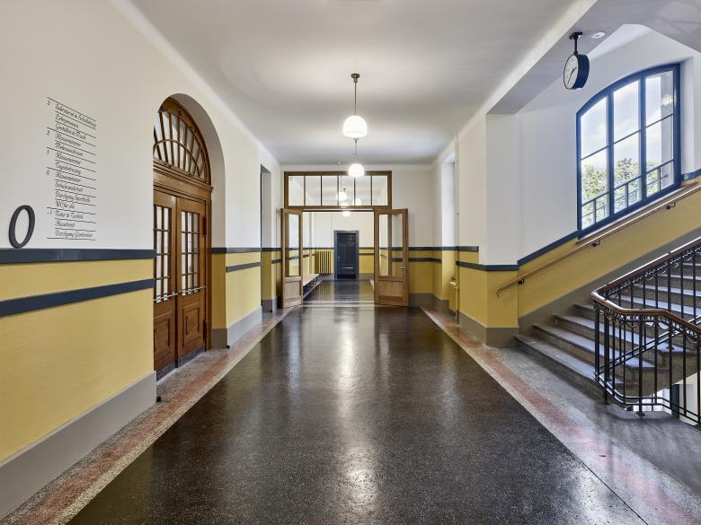 Um die bestehende Bausubstanz und ursprüngliche Raumstimmung zu wahren oder wieder herzustellen, wurde nach ursprünglichem Vorbild weiter gebaut und die Grenzen zwischen alt und neu verwischt. Der Eingangsbereich der Turnhalle wurde anhand von Archivplänen in eine einseitig offene Spielhalle umgebaut und wirkt selbstverständlich integriert als neues Gelenk der Schulanlage. Neue Einbauten im Inneren, wie Schränke, Trennwände und Türen wurden zugunsten der Wahrung der Raumstimmung nicht als klar ablesbare neue Elemente eingefügt, sondern in handwerklich auf die Entstehungszeit abgestimmter Optik oder als in ähnlichem Masse dekorativ geprägter Interpretationen erstellt. Auch die ursprüngliche Farbgebung wurde eruiert und an heutige Anforderungen hinsichtlich Helligkeit in Schulräumen angepasst und teilweise mit neu abgeleiteten oder wieder aufgegriffenen, nicht alltäglichen Farbkombinationen ergänzt. Wie ein roter Faden in Altrosa, schlängelt sich das Kunst und Bau Projekt «kommunizierende Röhren» durch den Bildungspalast.