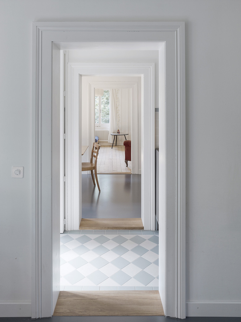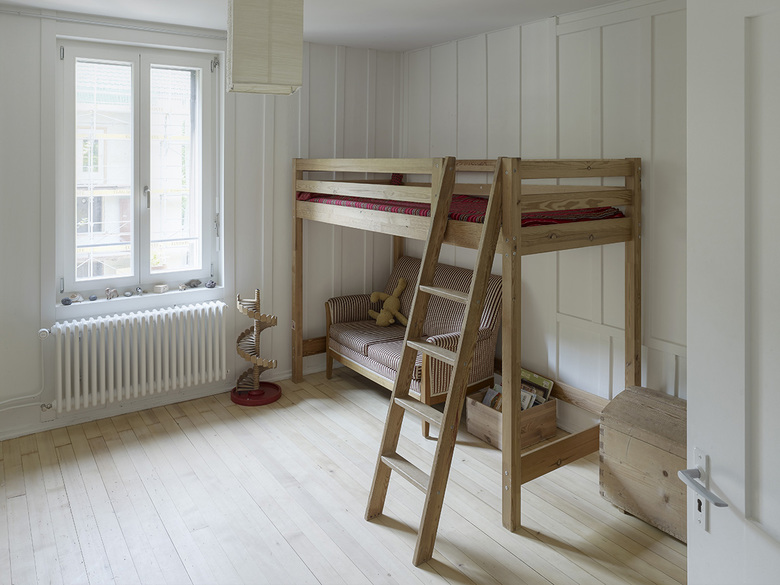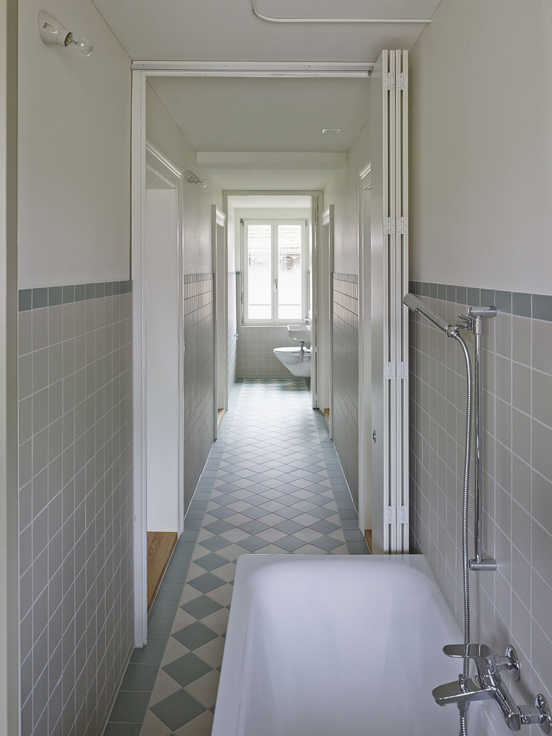 Das Haus wurde 1875 von dem Architekten Gottlieb Spring für das Berner Lorrainequartier entworfen und steht an einem Steilhang direkt an der Aare. Ursprünglich beherbergte es 18 kleine Einzimmerwohnungen, von denen jeweils vier über einen engen Mittelgang erschlossen waren. Durch einen minimalen Eingriff konnte die kammerartige Grundrissfigur in eine Raumstruktur für grössere Wohnungen transformiert werden. Lediglich die Wohnungstrennwände zwischen den Küchen wurden abgebrochen. Die zusammengelegten Räume bilden nun das Entrée mit einem Arbeitsplatz sowie eine geräumige Wohnküche. Der ehemalige Korridor wurde zu einem innenliegenden Bad umgenutzt, in dem Badewanne und WC mit einer Faltschiebewand abgetrennt werden können. Der Eingriff ermöglicht Blicke durch die ganze Gebäudetiefe, wodurch die Wohnungen trotz der knappen Raumgrössen eine ungewöhnliche Grosszügigkeit erhalten. Die Materialisierung, die sich am Bestand orientiert und den handwerklichen Ausdruck des Gebäudes weiterführt, verschafft eine warme, wohnliche Atmosphäre. Das Holztäfer wurde behutsam repariert und gestrichen, die Holzböden geschliffen und geölt. Die Fassade wurde gedämmt, durch die Schuppung der Bretterschalung können die Brandschutzanforderungen für die Hinterlüftung erfüllt werden. Zugleich erinnert die geschuppte Bretterschalung mit ihrer Farbigkeit und Oberflächentextur an die ursprüngliche, sandsteinfarbene Holzschindelverkleidung. Der Umbau erhielt 2015 den atuprix der Stiftung Auszeichnung Berner Baukultur sowie eine Anerkennung beim Prix Lignum.