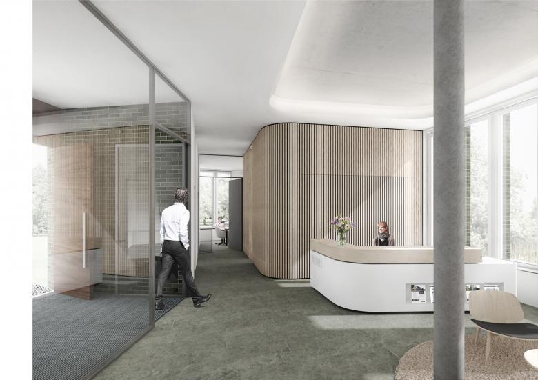 Eine einladende Atmosphäre begegnet dem Besucher bereits im Empfangsbereich. Erreicht wird dies durch den Einsatz weniger, wertiger Materialien wie naturbelassene geölte Eiche, geschliffener grün-grauer Anröchter Sandstein, in Verbindung mit warm gedämpften Weiss der Wände und einem durchdachten Beleuchtungskonzept. Während die äußere Hülle mit glasiertem Ziegel eine glänzende Oberfläche erhält werden im Innenbereich ausschließlich Materialien mit matten Oberflächen eingesetzt.