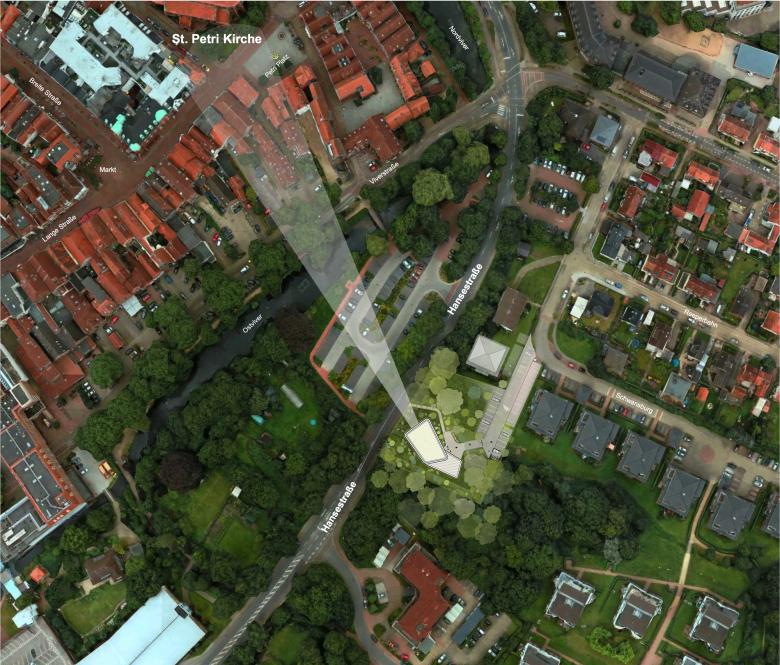 Der Entwurf präsentiert sich als klares Volumen, dunkelgrün glasierter Ziegel, der den atmosphärischen Reichtum der umgebenen Natur widerspiegelt, verschafft dem Gebäude die Wirkung eines markanten Solitärs. Gleichzeitig brechen die großzügigen Fensterflächen mit filigranen Fensterprofilen die Homogenität und geben dem Gebäude Leichtigkeit und Transluzenz. Als Grundform einem abgewinkelten Y ähnlich, formuliert das Gebäudevolumen eine Willkommens-Geste auf der Eingangsseite, während im Gebäude eine Blickachse auf den Kirchturm der St. Petri Kirche aufgebaut wird. Weiche Konturen mit abgerundeten Ecken verleihen dem Gebäude Bewegung und Dynamik.