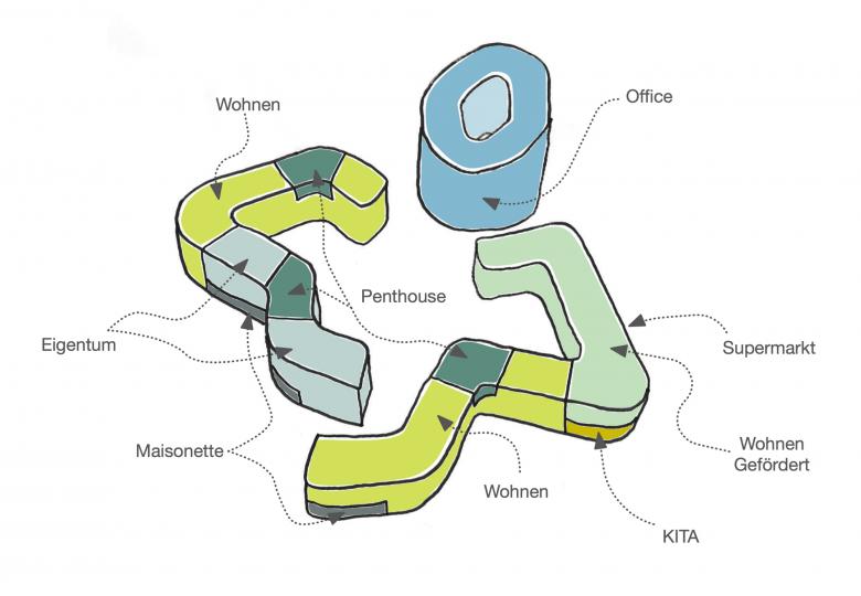 Es lassen sich in der Gesamtabwicklung unterschiedliche Bausteine flexibel anordnen. Neben gewohnten Wohnformen in 2-, 3 und 4-Spännern sind auch Sonderwohnformen wie Micro-Apartments denkbar.