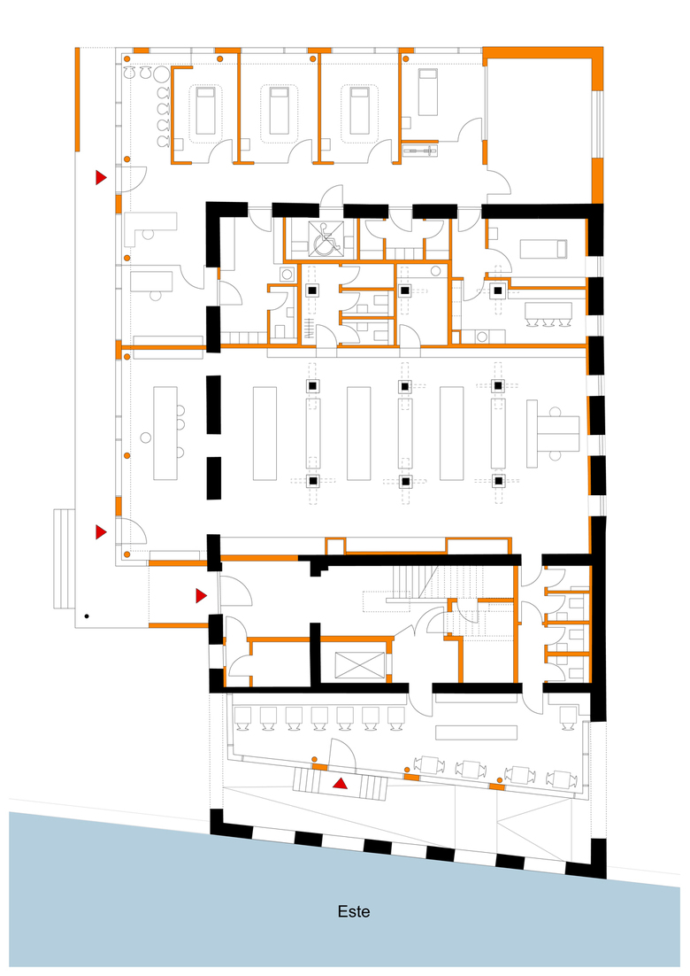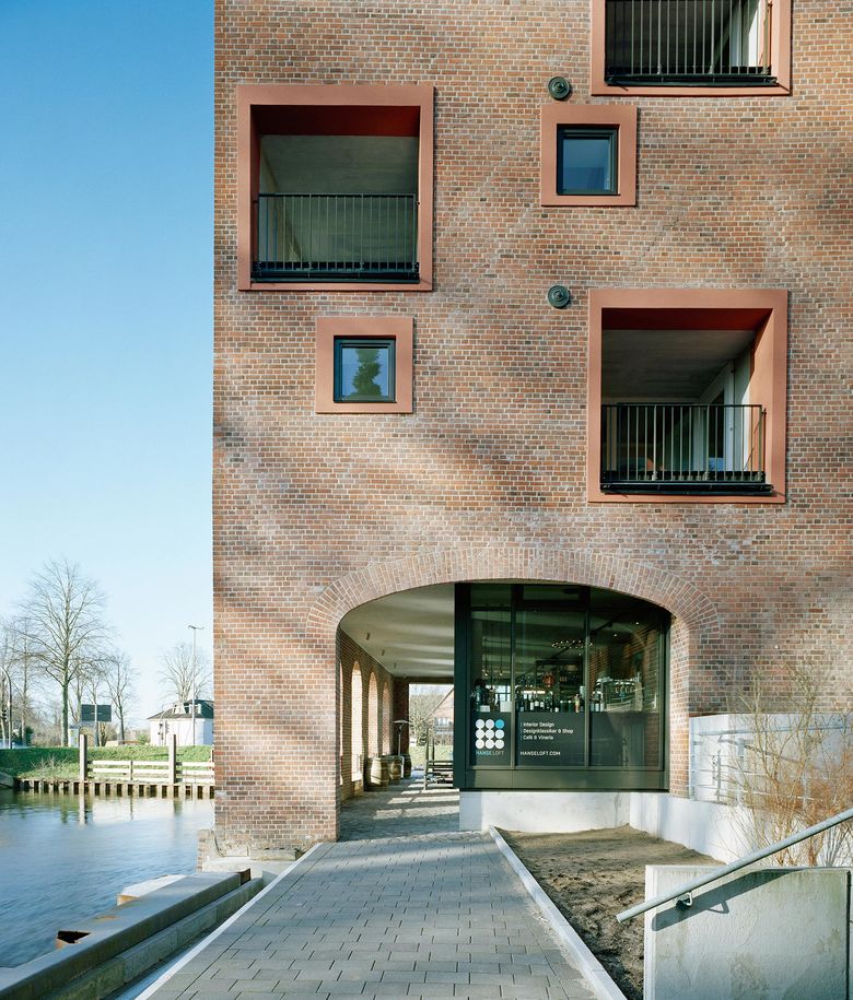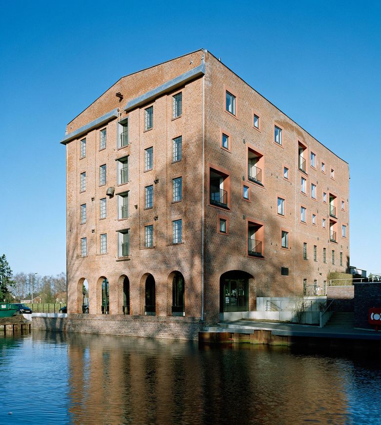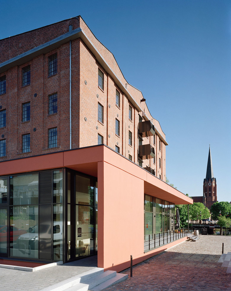 In das ehemalige Mühlen- und Lagergebäude wurden im Erdgeschoss drei Gewerbeflächen und in den Obergeschossen 14 Wohnungen integriert. Ein eingschossiger Anbau als leichter, modernere Baukörper wurde im Erdgeschoss ergänzt, der sich im Norden und Westen an das Gebäude anschmiegt. Im wieder geöffneten Arkadenbereich zur Este wurde ein Café eröffnet. Die Obergeschosse mit etwa 400 qm Fläche, beherbergen jeweils vier Wohnungen. Drei der Wohnungen im ersten Geschoss erhielten eingelassene Dachterrassen auf dem Anbau. Auf dem Dach entstanden für die drei Wohnungen in einem zurückversetzten, kubischen Baukörper Dachterrassen und Studios, damit der äußere Eindruck des denkmalgeschützten Gebäudes nicht verändert wird.