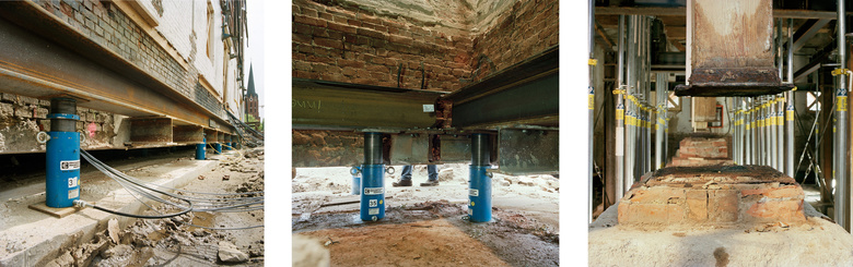 Während im vorderen Bereich an der Este noch intakte Holzpfähle das Haus stützen, wurde beim Bau 1914 im hinteren Bereich darauf verzichtet. Die dortige Flachgründung auf dem Torfboden hat im Laufe der Jahrzehnte dem enormen Druck nicht standgehalten. In dieser Schieflage wäre eine Wohnnutzung nicht denkbar gewesen. Deshalb wurde der 1500 Tonnen schwere Koloss durch hydraulische gesteuerte Pressen hinten angehoben und vorne abgesenkt, wodurch die Absackung von 43 cm ausgeglichen wurde (Translozierung). Anschließend wurde das Gebäude auf ein solides neues Pfahlfundament umgelastet.