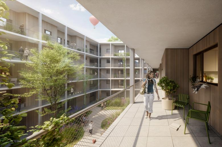 Die Innenfassade zum Hof wird maßgeblich durch die hellen Laubengänge mit ihren schlanken Stützen und den berankbaren filigranen Geländern geprägt. Der Laubengang wird durch die vor- und zurückspringende Fassade gegliedert. Vor jedem Wohnungseingang weitet sich der Laubengang auf. Diese Fassade erhält eine warme und strukturierende Holzverkleidung, welche die Aufenthaltsqualität stärkt.
